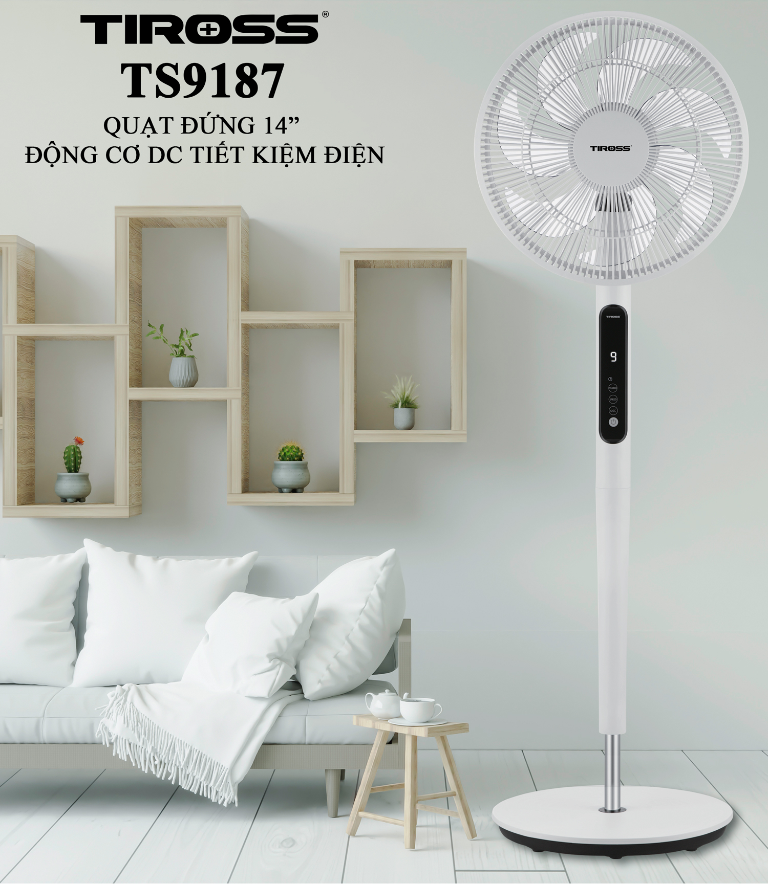 Quạt đứng Tiross TS9187 tiêu thụ điện năng thấp Ưu điểm của quạt cây Tiross TS9187 là được thiết kế cánh quạt độc đáo cùng động cơ DC Inverter tiên tiến mạnh mẽ giúp luồng gió thổi mạnh hơn, xa hơn nhưng vận hành vẫn nhẹ nhàng, êm ái. Màu sắc trang nhã, hiện đại, nhỏ gọn, dễ dàng di chuyển và lắp đặt ở mọi không gian.   Động cơ DC inverter làm mát với công suất 19W tiết kiệm điện Tiross TS9187 có 7 cánh quạt với đường kính 40cm tăng thêm tính thẩm mỹ cho sản phẩm. Tốc độ gió mạnh mẽ cùng 9 cấp độ khác nhau, mang đến nhiều sự lựa chọn làm mát cho mỗi người. Công suất 19W với động cơ DC có khả năng làm mát mạnh mẽ, nhưng vẫn tiêu thụ ở mức điện năng thấp nhất. Đặc biệt, sản phẩm có góc xoay lớn, tản gió rộng, giúp thổi đều gió khắp không gian phòng.   Lưu ý khi sử dụng quạt điện: - Nên sử dụng ở mức gió nhẹ đến trung bình, không bật quạt số cao và để suốt đêm. - Không ngồi ngay vào quạt khi cơ thể đang tiết mồ hôi nhiều khiến mất cân đối nhiệt.