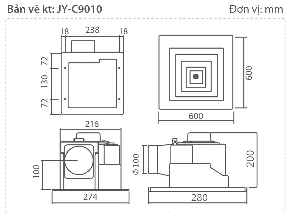 Quạt hút thông gió âm trần JY-B90132N - Lưu lượng gió: 100m3/Hr - Công suất mô tơ: 18W - Kích thước khoét lỗ: 210x210mm - Kích thước mặt nạ : 278x278mm - Điện áp: AC