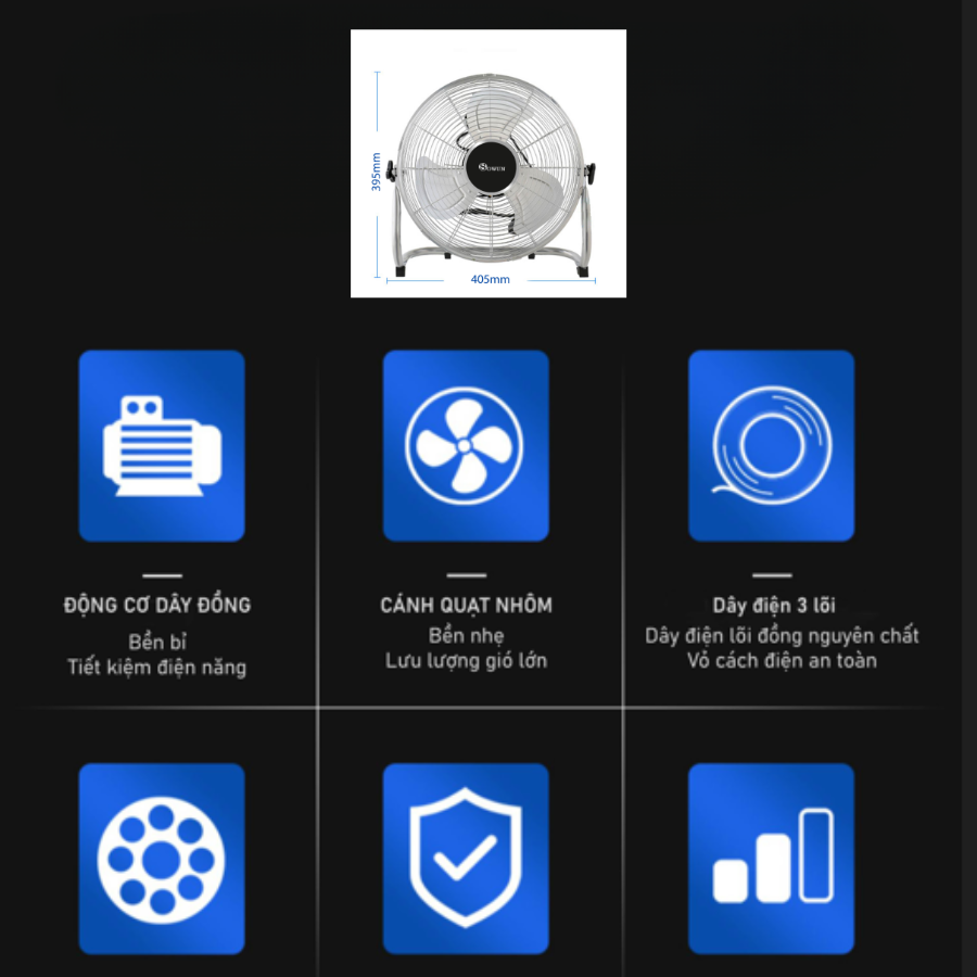 Đặc điểm nổi bật Thiết kế chân đế quạt to, vững chắc, không rung lắc khi hoạt động 5 cánh quạt sải cánh dài 39 cm làm mát hiệu quả trên không gian lớn Quạt