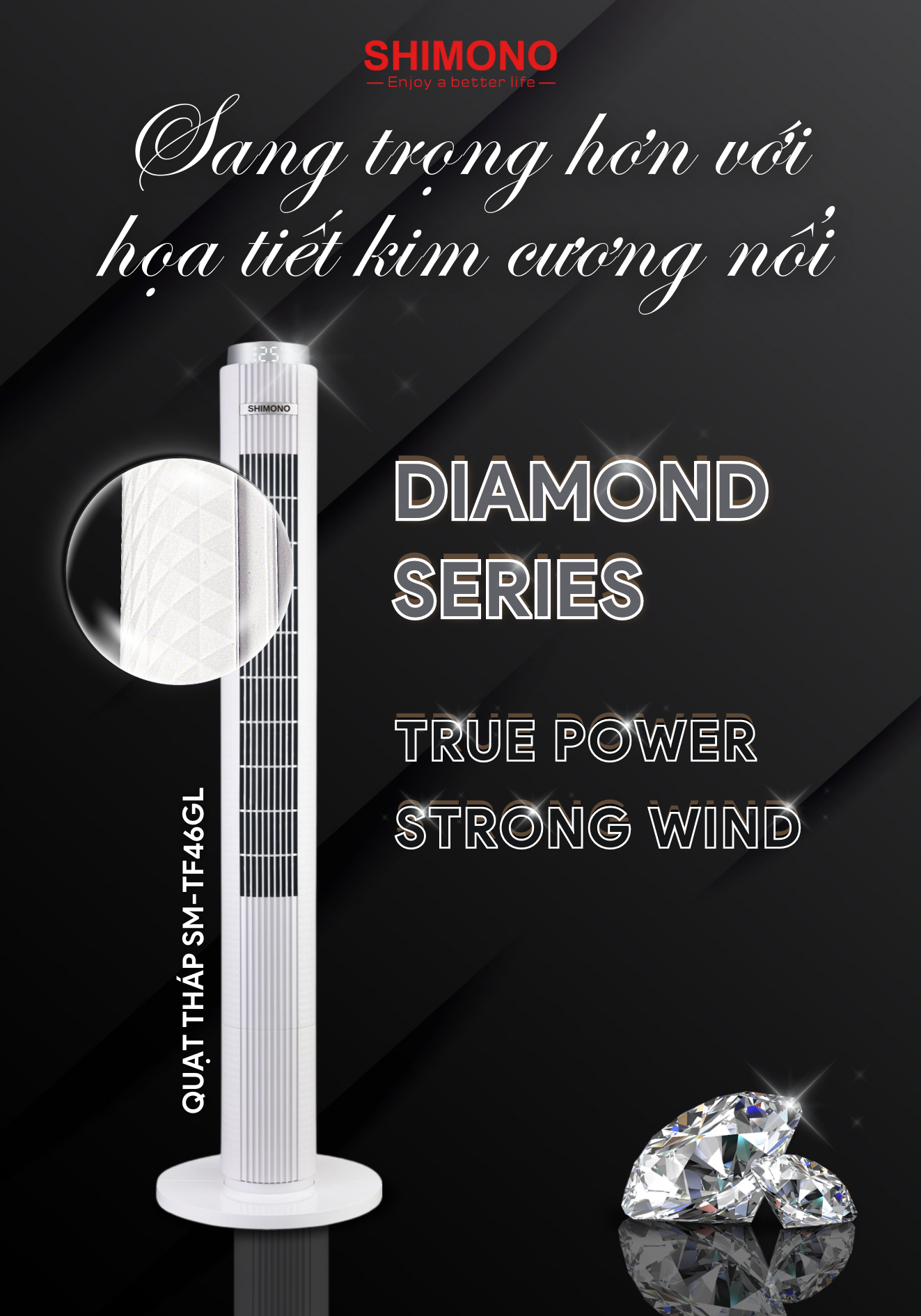 ✨Quạt Tháp SHIMONO SM-TF46GL 45W Họa Tiết Kim Cương Cao Cấp, Màn Hình Led Hiển Thị Nhiệt Độ Phòng, Cao 117cm, BH 12 Tháng Hàng Chính Hãng