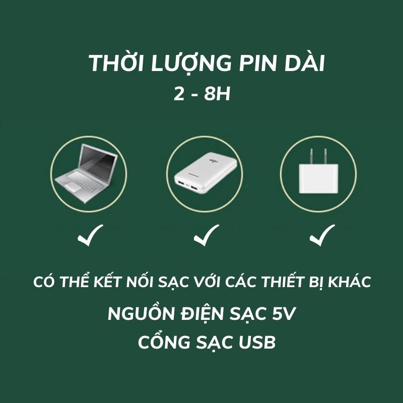 THÔNG TIN SẢN PHẨM: Thời gian sử dụng liên tục lên đến 8 tiếng Với dung lượng pin 1200mAh, quạt có thể sử dụng liên tục lên đến 8 tiếng Nhỏ gọn CHẾ ĐỘ BẢO HÀNH: Sản phẩm được bảo hành ĐỔI MỚI trong 18 tháng trong trường hợp lỗi của nhà sản xuất. Tem bảo hành còn nguyên vẹn,