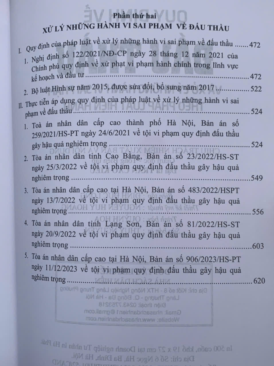 Quy định về đấu thầu và xử lý những hành vi sai phạm theo pháp luật hiện hành Tác giả: PGS.TS.GVCC Nguyễn Thị Ngọc Hoa Nhà xuất bản: Công an nhân dân Công ty phát hành: Dân Hiền Số trang: 648 Kích thước: 19 x 27 cm Năm xuất bản: Tháng 11 năm 2024 Giá bìa: 450.000 đ Nội dung nổi bật: Cuốn sách “Quy định về đấu thầu và xử lý những hành vi sai phạm theo pháp luật hiện hành” là một tài liệu chuyên sâu, cập nhật toàn diện các quy định pháp luật về đấu thầu và xử lý các hành vi sai phạm trong lĩnh vực này. Được viết bởi PGS.TS.GVCC Nguyễn Thị Ngọc Hoa, một chuyên gia uy tín trong lĩnh vực luật pháp, cuốn sách hướng đến việc hỗ trợ các nhà quản lý, chuyên gia pháp lý, và cá nhân làm việc trong các cơ quan công quyền hoặc tổ chức kinh tế nắm rõ các quy định hiện hành, đồng thời nâng cao hiệu quả áp dụng pháp luật vào thực tiễn. Cấu trúc cuốn sách: Phần I: Quy định về đấu thầu theo pháp luật hiện hành Phần này trình bày chi tiết các quy định pháp luật về đấu thầu, với nội dung chính bao gồm: Luật Đấu thầu 2023: Có hiệu lực từ ngày 1/1/2024, quy định các nguyên tắc, quy trình tổ chức và lựa chọn nhà thầu, cùng những cải cách quan trọng nhằm nâng cao tính minh bạch và hiệu quả của hoạt động đấu thầu. Hệ thống các nghị định, thông tư quan trọng: Nghị định số 23/2024/NĐ-CP và 24/2024/NĐ-CP: Hướng dẫn cụ thể các quy trình, điều kiện thực hiện đấu thầu. Thông tư số 02/2024/TT-BKHĐT và các thông tư liên quan: Quy định về đào tạo, cấp chứng chỉ và quản lý đấu thầu. Thông tư của Bộ Y tế (05/2024/TT-BYT): Danh mục thuốc, vật tư y tế được đấu thầu tập trung quốc gia, áp dụng hình thức đàm phán giá. Phần này tập trung vào việc cung cấp các quy định pháp lý chi tiết, cùng các mẫu biểu và công cụ hỗ trợ giúp việc thực thi trở nên dễ dàng và chính xác hơn.   Phần II: Xử lý những hành vi sai phạm về đấu thầu Phần này tập trung vào việc xử lý các vi phạm trong hoạt động đấu thầu, bao gồm: Quy định xử phạt hành chính: Dựa trên Nghị định số 122/2021/NĐ-CP và các văn bản liên quan, phần này trình bày các mức phạt và biện pháp khắc phục hậu quả đối với các hành vi vi phạm trong lĩnh vực đấu thầu. Áp dụng luật hình sự trong xử lý vi phạm đấu thầu: Các quy định từ Bộ luật Hình sự 2015 (sửa đổi, bổ sung 2017) về các tội danh liên quan đến đấu thầu, đặc biệt là những vi phạm gây hậu quả nghiêm trọng. Các vụ án tiêu biểu: Cung cấp 5 bản án từ các tòa án tại Hà Nội, Cao Bằng, Lạng Sơn với các bản án cụ thể từ năm 2021-2023. Mỗi vụ án được cung cấp chi tiết từ góc độ pháp lý, giúp người đọc hiểu rõ cách áp dụng quy định pháp luật trong thực tế.