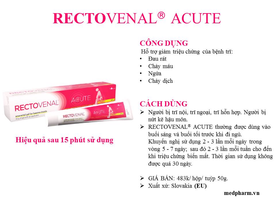 - Đặc biệt trong các trường hợp bị TRĨ, nứt kẽ h.ậu môn. Sản phẩm được bào chế dạng gel bôi, theo tiêu chuẩn EU GMP và ISO-13485, chứng nhận CE châu Âu- Số: 2020-MDD/QS-014/B. Thành phần của gel bôi trĩ RECTOVENALACUTE Chiết xuất vỏ cây sồi (Quercus robur), diosmin, hesperidin, carbomer 940, natri hydroxide, methylparaben, propylparaben và nước cất. HƯỚNG DẪN SỬ DỤNG: Khi cần thiết, bôi một lượng gel vừa đủ vào vùng h.ậu môn 2 – 3 lần mỗi ngày. Trước khi dùng, làm sạch da và êm mạc xung quanh vùng h.ậu môn bằng nước ấm (không sử dụng xà phòng) và lau khô bằng khăn mềm. Trước mỗi lần dùng, loại bỏ lượng gel còn sót lại sau lần dùng trước hoặc lượng sản phẩm được sử dụng tại chỗ khác. RECTOVENAL ACUTE thường được dùng vào buổi sáng và buổi tối trước khi đi ngủ. Khuyến nghị sử dụng 2 – 3 lần mỗi ngày trong vòng 5 – 7 ngày; sau đó 2 – 3 lần mỗi tuần cho đến khi ệu ch.ứng biến mất. Thời gian sử dụng không được quá 30 ngày. CÁCH SỬ DỤNG: RECTOVENAL ACUTE có thể được bôi ở vùng h.ậu môn theo theo hai cách sau: Bôi trực tiếp bằng ngón tay Bóp nhẹ tuýp nhựa để lấy ra lượng gel vừa đủ trực tiếp lên ngón tay và dùng ngón tay này thoa cẩn thận quanh vùng h.ậu môn. Vặn nắp đậy vào tuýp ngay sau khi sử dụng để tránh gel bị khô. Sử dụng dụng cụ chuyên dụng (dụng cụ bôi) đi kèm. Sau khi mở nắp đậy khỏi tuýp, gắn dụng cụ bôi đi kèm vào tuýp và tháo nắp đậy trên dụng cụ bôi. Đặt tuýp cùng dụng cụ bôi vào vùng h.ậu môn và bóp nhẹ nhàng tuýp gel cho đến khi có đủ lượng gel. Ngay sau khi sử dụng, tháo dụng cụ bôi ra và rửa sạch bằng nước ấm, để khô, đậy nắp. Đậy nắp tuýp để ngăn gel bị khô. Giấy tiếp nhận đăng ký bản công bố sản phẩm: 230002502/PCBB-HCM Nhập khẩu và phân phối bởi: CÔNG TY CỔ PHẦN DƯỢC MEDPHARM