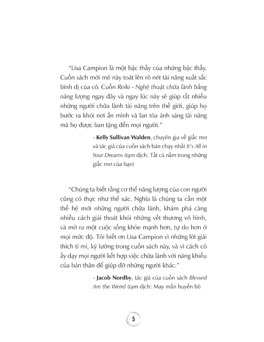 Reiki - Nghệ Thuật Chữa Lành Bằng Năng Lượng “Reiki là một trong những phương pháp chữa lành bằng năng lượng đơn giản và mang tính trực giác nhất. Là kỹ thuật chữa lành bằng năng lượng mang tính thực hành, hiệu quả, nhẹ nhàng, có nguồn gốc từ Nhật Bản, và ai cũng có thể học được.” “Giúp khai phá và phát triển năng lực bí ẩn trong bạn, giúp chữa lành những tổn thương, cân bằng tâm trí và cảm xúc.” Mọi người đều có trực giác, và nhiều người trong chúng ta có khả năng ngoại cảm. Chúng ta có thể phát triển những năng lực này nếu tập trung và hành động. Nếu bạn sở hữu tài năng tiềm tàng mạnh mẽ, đó sẽ là một phần mục đích sống của bạn và thật sáng suốt khi mài giũa chúng. Việc học Reiki có thể khai phá sự nhạy cảm tiềm tàng và năng lực ngoại cảm trong bạn. Nếu bạn đã sở hữu năng lực ngoại cảm và trực giác, trải qua những cấp độ thực hành Reiki, có thể bạn sẽ sở hữu nhiều năng lực hơn thế. Năng lực thấu cảm và ngoại cảm là bộ công cụ mạnh mẽ, hiệu quả của những người chữa lành. Nhận biết và phát triển năng lực thấu cảm và ngoại cảm nên là một phần của quá trình học tập Reiki. Nếu bạn đã biết mình có năng lực thấu cảm và ngoại cảm, việc học Reiki sẽ khai phá năng lực ấy sâu hơn và nhanh hơn. Cả năng lực chữa lành và ngoại cảm là những kết quả đi kèm cùng với sự phát triển về tinh thần, và Reiki là con đường hiệu quả giúp trưởng thành về tinh thần. Năng lực ngoại cảm tự nhiên sẽ tăng lên khi chúng ta trưởng thành về tinh thần. Nhưng, luôn có những va chạm, xung đột trên con đường ấy, đòi hỏi sự hòa hợp và phát triển, và Reiki giúp ích rất nhiều. Reiki – Nghệ thuật chữa lành bằng năng lượng sẽ giúp chúng ta hợp nhất năng lực thấu cảm, năng lực ngoại cảm và năng lực chữa lành một cách lành mạnh. Xuyên suốt cuốn sách này, sẽ có nhiều bài tập và bài thiền đa dạng, giúp các bạn khám phá những nguyên tắc của Reiki cũng như tiếp tục nâng cao hiểu biết và khả năng thực hành Reiki của mình. Reiki thực sự rất dễ hiểu, dễ tiếp cận, nên nó là cánh cổng tuyệt vời cho bất cứ ai muốn khám phá một người chữa lành, nhất là một người chữa lành bằng năng lượng là như thế nào. Và, bạn cũng sẽ được chữa lành trên con đường này. Nếu bạn yêu thích phương pháp Reiki và muốn nâng Reiki lên mức độ cao hơn, bạn đã chọn đúng cuốn sách mình cần. Lòng trắc ẩn và kinh nghiệm của một giảng viên, một người chữa lành, một người ngoại cảm, và một tác giả của Lisa sẽ biến hành trình thực hành Reiki đi sâu hơn vào việc chữa lành, biến điều đó thành một trải nghiệm làm thay đổi cuộc đời. Trích dẫn hay trong tác phẩm Chúng ta biết rằng cơ thể năng lượng của con người cũng có thực như thể xác. Nghĩa là chúng ta cần một thế hệ mới những người chữa lành, khám phá càng nhiều cách giải thoát khỏi những vết thương vô hình, và mở ra một cuộc sống khỏe mạnh hơn, tự do hơn ở mọi mức độ. Có những đặc trưng và tính cách của người thấu cảm giúp phân biệt họ với những người khác. Nếu bạn là một người thấu cảm, việc nhìn thấy bức tranh toàn cảnh có thể giúp bạn nhận thức được những thách thức bạn phải đối mặt trong cuộc sống. Những người thấu cảm rất nhạy cảm với cảm xúc của người khác giống như những đứa trẻ cảm nhận được cảm xúc của mọi người trong gia đình. Những người thấu cảm không thích đám đông và thường là những người hướng nội. Họ cảm thấy bị lấn át ở những nơi đông đúc, như rạp chiếu phim, siêu thị, sân bay, hoặc bệnh viện Reiki thực sự rất dễ hiểu, dễ tiếp cận, nên nó là cánh cổng tuyệt vời cho bất cứ ai muốn khám phá một người chữa lành, nhất là một người chữa lành bằng năng lượng. Thông tin về Tác giả Lisa Campion là một nhà tư vấn ngoại cảm và một bậc thầy Reiki với hơn hai mươi lăm năm kinh nghiệm thực hành và giảng dạy Reiki Ngoại cảm. Cô sống ở Boston, Massachusetts. Người viết lời nói đầu Rhys Thomas là tác giả của cuốn sách Discover Your Purpose (tạm dịch: Khám phá Mục đích sống của bạn), người sáng lập Trung tâm Y học Năng lượng Rhys Thomas, và sáng tạo Rhys Methods .