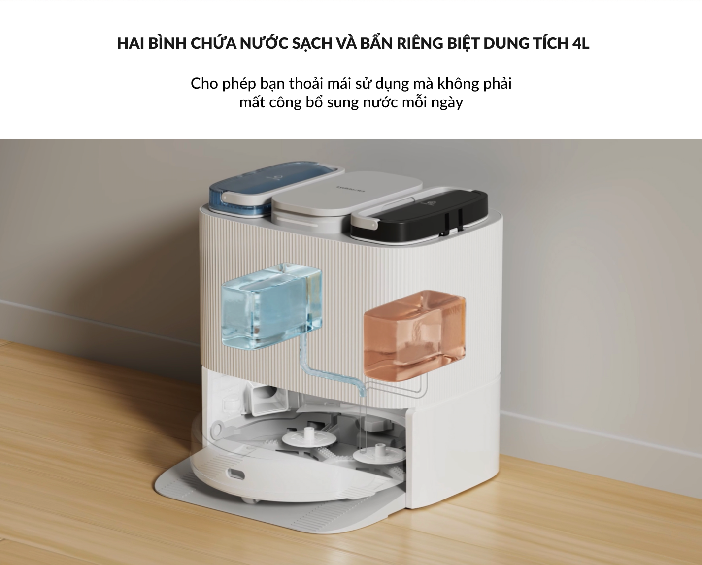 Tích hợp công nghệ Quét laser 3D định vị hệ thống hiển thị bản đồ toàn bộ ngôi nhà. Chốt quét: 2 chiếc Tự động quay về dock sạc, leo dốc 3cm. Thời gian sạc