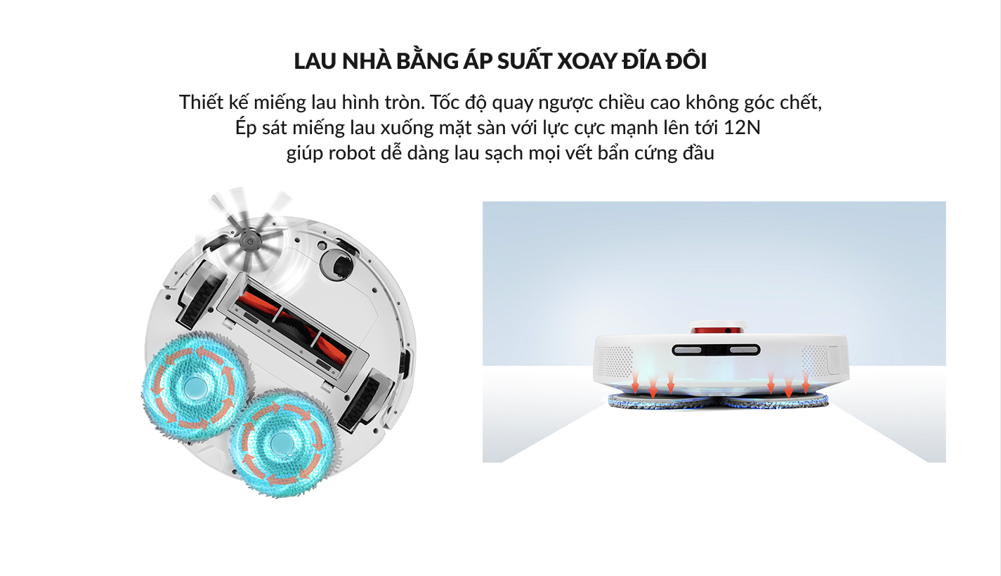 - Công nghệ điều hướng ElegantGyro với cảm biến - Công suất động cơ 1800 PA, 7 chế độ, Ứng dụng có thể lập trình, Alexa và Trợ lý Google - Quét, hút bụi, lau