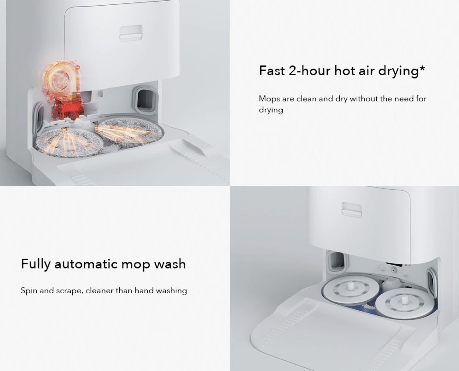 Để có thể dọn dẹp sạch sẽ và hiệu quả nhất khi hoạt động. Sau mỗi lần dọn dẹp, khăn lau sẽ được rửa tự động bằng các tia nước mạnh, đồng thời được xoay với tốc độ cao, để làm sạch các vết bẩn trên khăn lau nhà. Với lực giặt mạnh mẽ, khi sử dụng trạm vệ sinh sẽ có hiệu quả làm sạch hơn khi vệ sinh bằng tay gấp nhiều lần.