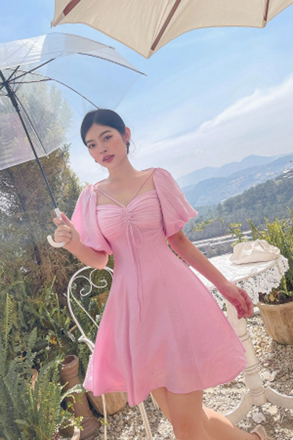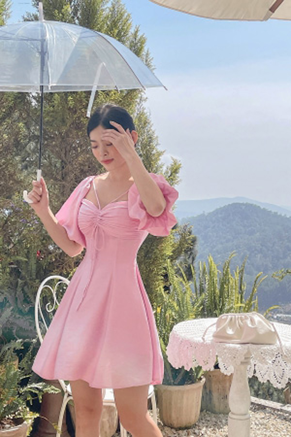 ღ THÔNG TIN SẢN PHẨM: Tên sản phẩm: Đầm hồng cổ yếm tay phồng Chất liệu: Chất gân ý Chi tiết sản phẩm: không lót Thông số size: S, M, L,
