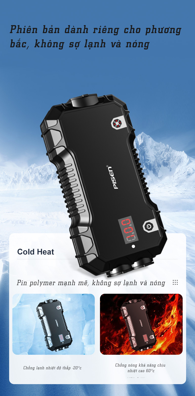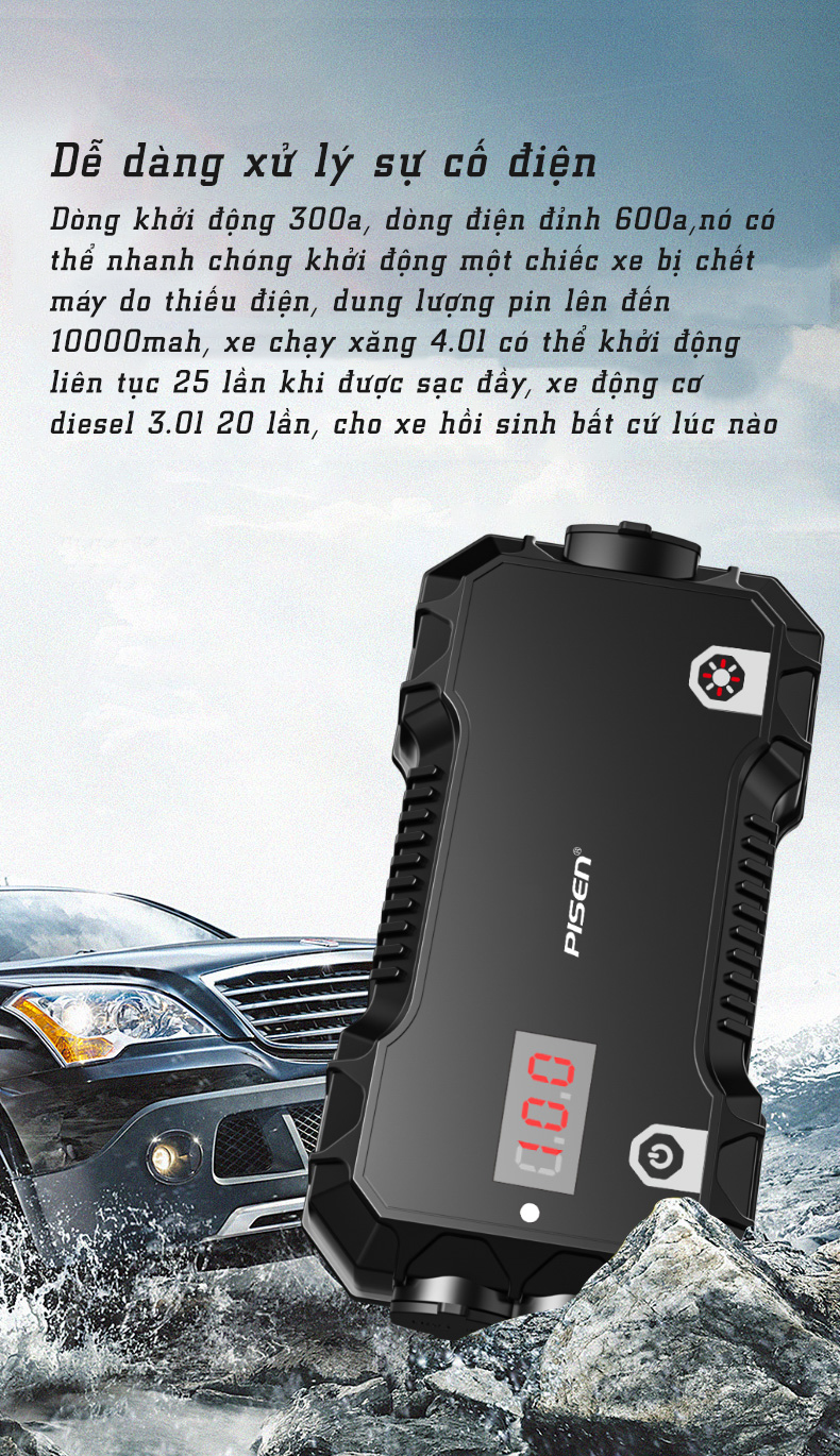 Nhà sản xuất: PISEN GROUP, nhà phát minh ra sạc dự phòng đầu tiên trên thế giới với kinh nghiệm gần 20 năm nghiên cứu và phát triển các dòng sản phẩm sạc dự phòng, nguồn điện di động. Sản phẩm được nghiên cứu, phát triển, sản xuất và kiểm tra chất lượng nghiêm ngặt trước khi xuất xưởng, đảm bảo các tiêu chuẩn chất lượng nghiêm ngặt tại các thị trường khó tính như Mỹ, Nhật, EU, Dubai, Nga,…    THÔNG SỐ KỸ THUẬT:   Mã sản phẩm: CCY-DY14 Đầu vào: Type-C: 5V/2A, 9V/2A Đầu ra: USB-A : 5V/2.1A Dung lượng Pin: 10000mAh – 37Wh Điện áp khởi động: 12V Dòng khởi động: 200A Dòng Max: 600A    CÁCH THỨC SỬ DỤNG:    Lắp kẹp đánh lửa thông minh vào cổng EC5(Cổng 12V) của nguồn điện khởi động, đèn của kẹp thông minh sẽ nhấp nháy luân phiên đỏ và xanh Gắn kẹp thông minh vào ắc quy ô tô ( cực dương của kẹp đánh lửa tương ứng với cực dương của ắc quy ô tô và cực âm của kẹp đánh lửa tương ứng với cực âm của ắc quy ô tô) Khi đèn led của kẹp thông minh bật xanh, xe có thể được khởi động Sau khi khởi động xong, tháo dây kẹp trong vòng 30 giây Chú ý!!! :   1 : Không khởi động liên tục, thời gian khởi động không quá 5 giây, và lần khởi động thứ 2 cần cách nhau khoảng thời gian hơn 30 giây   2 : Để bảo vệ ắc quy và tránh tụt pin của bộ khởi động, vui lòng rút nguồn khởi động khẩn cấp ngay sau khi khởi động được xe   Mô tả ánh sáng đèn:   1 : Nhấn nhanh nút công tắc đèn led để bật chức năng đèn led   2 : Khi đèn bật, nhấn nhanh nút công tắc đèn led để chuyển giữa chế độ nhấp nháy và SOS   CHỨC NĂNG CỦA DÂY KẸP THÔNG MINH: 1 : Bảo vệ khi nguồn điện cấp quá cao   2 : Bảo vệ khi nguồn điện cấp quá thấp   3 : Bảo vệ ngắn mạch đầu kẹp đỏ và đen   4 : Chống đảo ngược đầu kẹp đỏ và đen trên cực âm và cực dương của ô tô   5 : Sau khi kích máy động cơ, nó có thể được sạc ngược lại nguồn điện khẩn cấp   6 : Chống dòng khởi động vượt quá dòng định mức của pin nguồn khẩn cấp       MÔ TẢ ĐÈN BÁO VÀ CÒI BÁO ĐỘNG: 1: Khi chỉ kết nối nguồn điện khởi động khẩn cấp, đèn đỏ và xanh lục nhấp nháy luân phiên và còi không kêu, cho biết điện áp của nguồn điện khởi động khẩn cấp phù hợp để đánh lửa.   2: Khi chỉ kết nối nguồn điện khởi động khân cấp, đèn đỏ luôn sáng, đèn xanh tắt và còi không kêu, cho thấy điện áp của nguồn khởi động khẩn cấp không phù hợp để đánh lửa