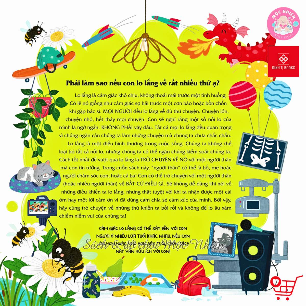 - Chiến thắng lo lắng Bao quát mọi vấn đề xoay quanh cuộc sống của trẻ khi ở nhà hay trên lớp, trong các mối quan hệ với người thân, bạn bè hay thầy cô giáo, cùng lời văn thân thiện và minh họa hấp dẫn, cuốn sách đưa ra những gợi ý lý tưởng để cha mẹ dẫn dắt trẻ chia sẻ lo âu và bộc bạch cảm xúc, giúp trẻ vượt qua những thử thách trong cuộc sống với sự tự tin, kiên cường và đôi khi với cả nụ cười trên môi! Đặc biệt, với sự tham gia cố vấn của chuyên gia tâm lý giáo dục trẻ em, giới thiệu rất nhiều lời khuyên hữu dụng, giúp trẻ rèn luyện năng lực xoay xở trước nghịch cảnh, đối diện nỗi sợ hãi, tập thói quen tư duy độc lập, làm chủ những suy nghĩ tiêu cực và trò chuyện về cảm xúc của mình. Vì Sao Bộ Sách Này Là Trợ Thủ Đắc Lực Cho Cha Mẹ Và Trẻ Nhỏ? Chuyên môn đáng tin cậy: Mọi nội dung đều được xây dựng với sự tư vấn của chuyên gia tâm lý giáo dục. Giải pháp thực tế: Hướng dẫn trẻ cách xử lý vấn đề từ những điều nhỏ nhặt đến phức tạp, phân chia cụ thể theo từng độ tuổi. Kết nối cha mẹ và con cái: Mở ra cơ hội để cha mẹ hiểu và trò chuyện cùng con, giúp gắn kết tình cảm gia đình.