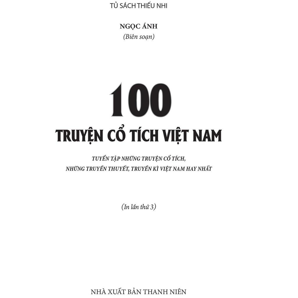 SÁCH: 100 TRUYỆN CỔ TÍCH VIỆT NAM Tác giả : Ngọc Ánh Nhà xuất bản: Thanh Niên Kích thước : 13.5 x 20.5 cm Năm xuất bản : 2016 Số trang : 384 Khối lượng : 310 grams Bìa : Bìa mềm Sách: 100 Truyện Cổ Tích Việt Nam Việt Nam có một kho tàng truyện cổ tích vô cùng đa dạng và phong phú. Mỗi truyện cổ tích không đơn thuần mang giá trị giải trí mà ẩn chứa trong đó là những bài học bổ ích mang tính giáo dục cao. Do đó, hầu hết các bé thiếu nhi đều được ông bà, cha mẹ, thầy cô kể cho nghe những câu chuyện cổ tích.
