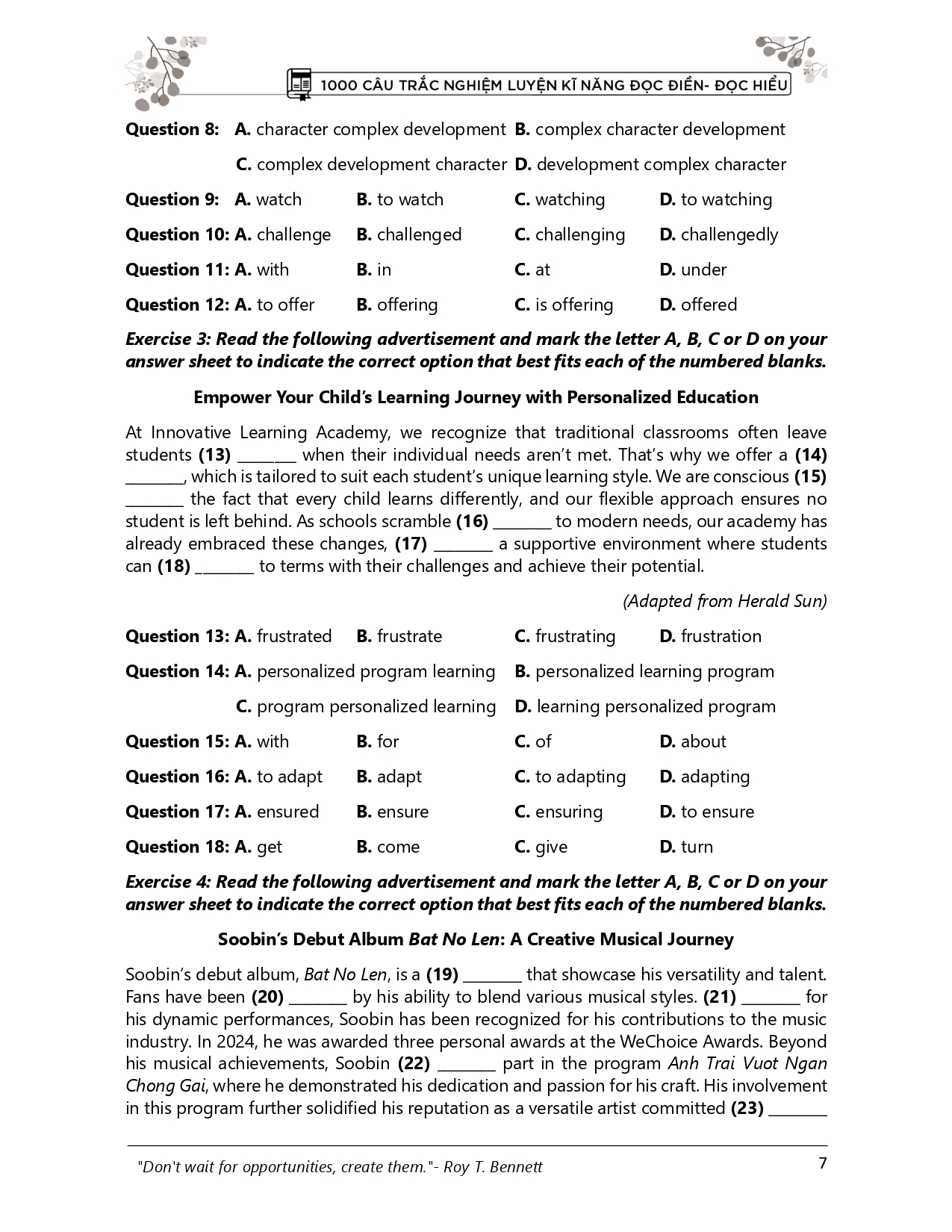 Các kỳ thi Tốt nghiệp THPT Quốc gia và Đánh giá năng lực ngày càng chú trọng vào kỹ năng đọc hiểu, vì vậy việc rèn luyện phương pháp và thực hành thường xuyên là chìa khóa để đạt điểm cao. Cuốn sách "1000 Câu Trắc Nghiệm Luyện Kỹ Năng Đọc Điền – Đọc Hiểu Môn Tiếng Anh" được biên soạn nhằm giúp các em nâng cao kỹ năng này, với hệ thống bài tập đa dạng, bám sát cấu trúc đề thi thực tế. Bố cục sách gồm 4 chuyên đề trọng tâm Chuyên đề 1: Đọc điền quảng cáo Chuyên đề 2: Đọc điền tờ rơi Chuyên đề 3: Đọc điền khuyết thông tin Chuyên đề 4: Đọc hiểu