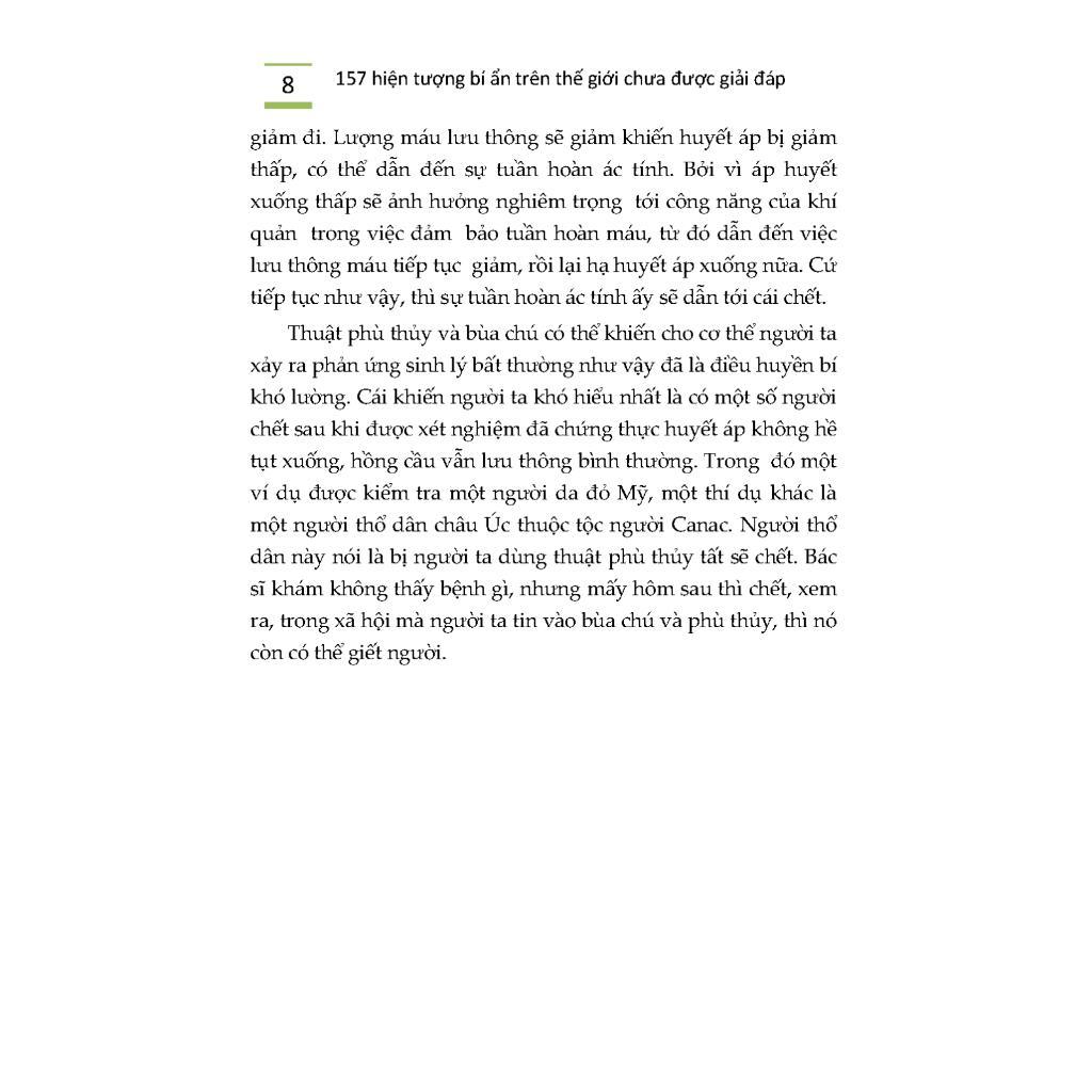 157 hiện tượng bí ẩn trên thế giới chưa được giải đáp (tái bản bìa mềm) Đây là cuốn sách tìm hiểu các hiện tượng trên thế giới bao gồm: I. Bí mật về thần chú và phép phù thủy II. Bí mật về giấc mộng và đoán mộng III. Những tiên đoán bí ẩn IV. Bí mật về hiện tượng trùng hợp huyền bí V. Bí mật về hồn ma và hồn ma bám theo người VI. Bí mật của thuật chiêm tinh VII. Những hiện tượng mất tích bí ẩn VIII. Khả năng kỳ lạ ở con người IX. Bí mật về những động vật kỳ dị X. Hiện tượng người rừng thần bí