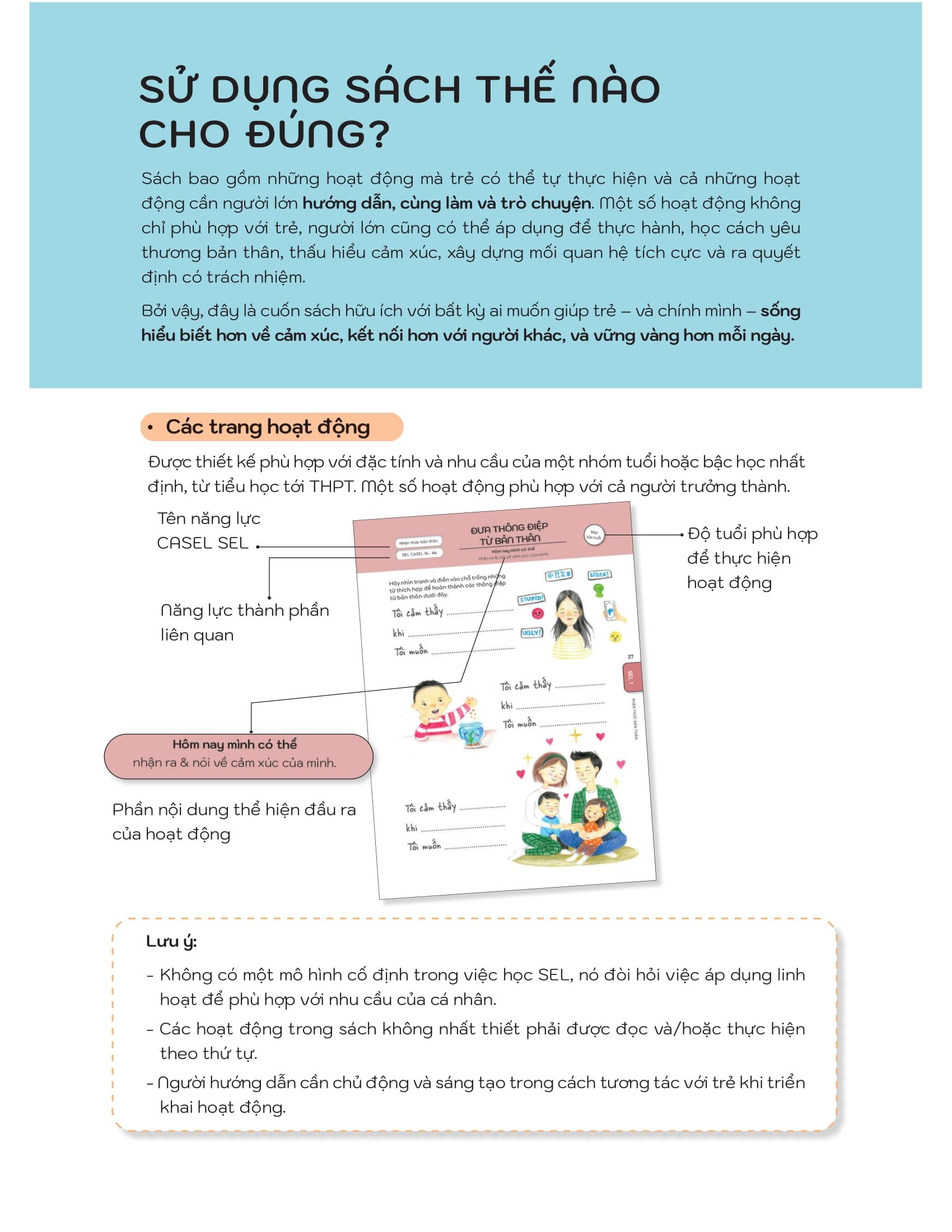 50+ Hoạt Động Phát Triển Năng Lực Cảm Xúc-Xã Hội 50+ hoạt động phát triển năng lực cảm xúc – xã hội là cuốn sách dành cho cha mẹ, thầy cô và những người làm giáo dục để thực hành giúp trẻ – và chính bản thân m.ình – phát triển những năng lực cảm xúc - xã hội cần thiết để sống hạnh phúc, hiểu biết và thích ứng trong một thế giới đầy biến động. Vì sao phát triển năng lực cảm xúc – xã hội (Social & Emotional Learning – SEL) ngày càng được coi trọng? Chúng ta đang sống trong một thời đại bất định, nơi cả người lớn và trẻ em đều phải đối mặt với những áp lực chưa từng có: từ ảnh hưởng kéo dài của đại dịch, sự bùng nổ của công nghệ, mạng xã hội đến tình trạng căng thẳng tâm lý ngày càng gia tăng. Trong bối cảnh đó, việc rèn luyện các năng lực như tự nhận thức, kiểm soát cảm xúc, đồng cảm, hợp tác và ra quyết định có trách nhiệm trở nên cấp thiết hơn bao giờ hết. Đây cũng chính là những kỹ năng được Tổ chức CASEL, đơn vị hàng đầu thế giới về giáo dục cảm xúc - xã hội, xác định là nền tảng giúp con người học tốt, sống khỏe và trưởng thành một cách lành mạnh. Với 50+ hoạt động phát triển năng lực cảm xúc – xã hội, cha mẹ và thầy cô sẽ được cung cấp hơn 50 hoạt động thực hành cụ thể, sinh động và dễ dàng áp dụng trên lớp, trong gia đình hoặc các buổi sinh hoạt nhóm. Đây là những hoạt động được thiết kế khoa học, rõ ràng với những ưu điểm nổi bật sau:
