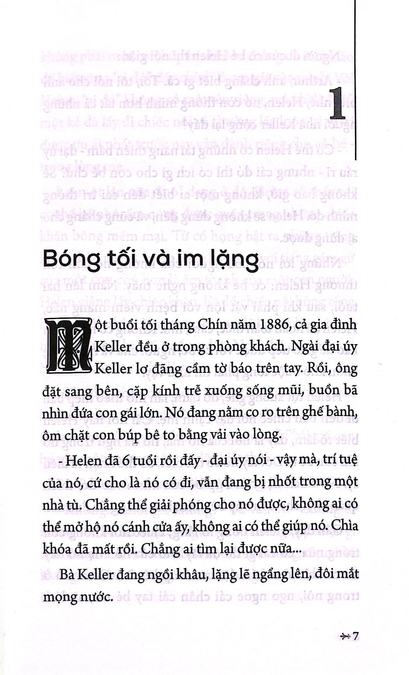 Bà Đại Sứ (PNU) Sau những ngày vật lộn với bệnh viêm màng não vào năm lên hai tuổi, Helen Keller đã hoàn toàn bị điếc, câm, mù. Tương lai tưởng chừng như đen tối