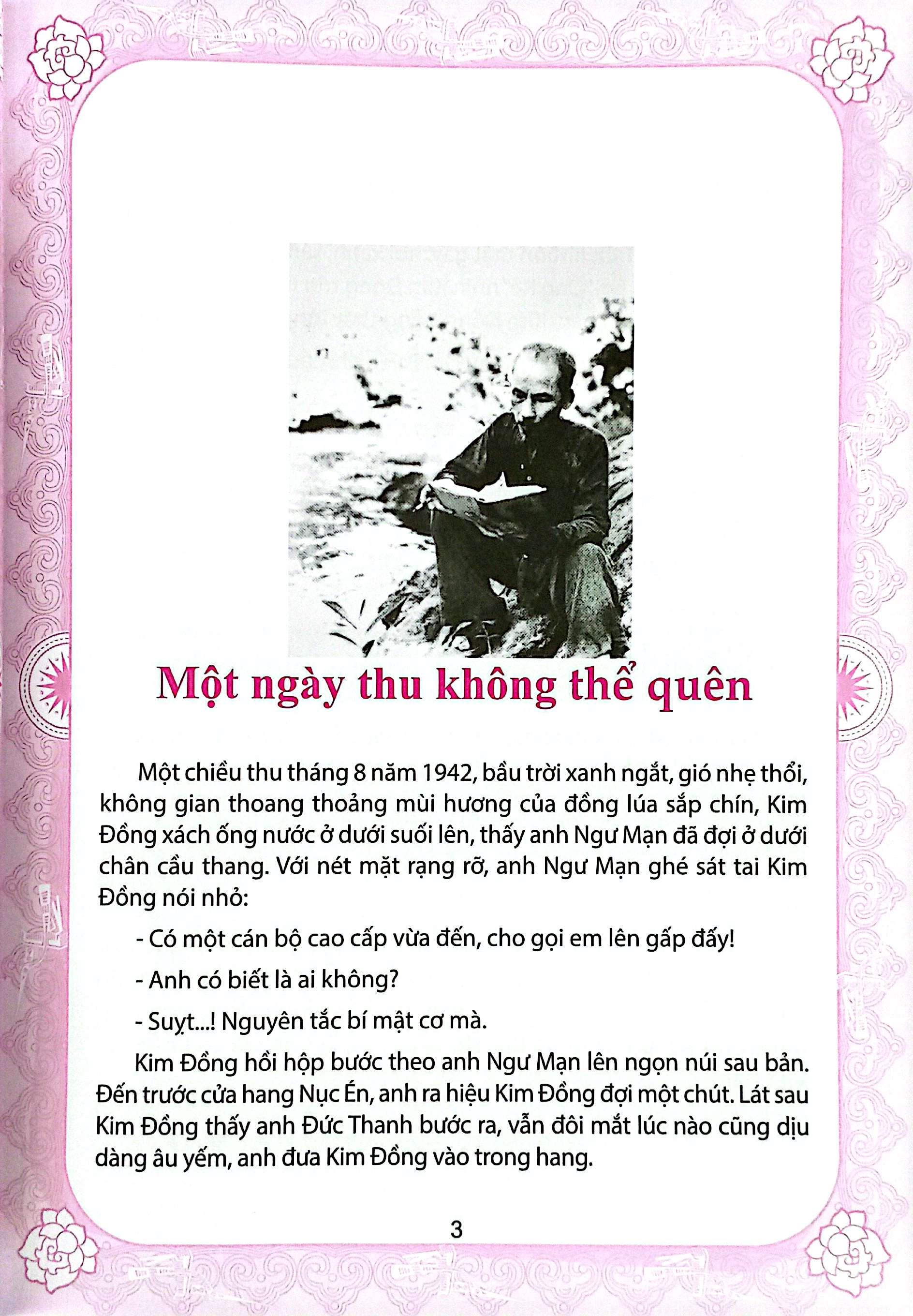Cháu bé nín khóc, cầm hoa, một tay nắm ngón tay Bác Hồ để Bác dắt đi. Sau đó, Bác nói riêng với cô giáo: