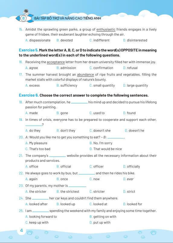 Cuốn sách BÀI TẬP BỔ TRỢ VÀ NÂNG CAO TIẾNG ANH 8 được biên soạn nhằm giúp các em học tập tốt hơn môn Tiếng Anh. Các em sẽ được làm quen với nhiều dạng bài tập nâng cao để có kĩ năng làm đúng các dạng bài khó hơn so với sách bài tập thông thường. Qua đây, các em sẽ có nhiều tự tin khi luyện các dạng bài khó hằng ngày. Ernest Hemingway đã từng nói: "Không có người bạn nào trung thành như một cuốn sách". Hi vọng rằng cuốn sách Bài tập bổ trợ và nâng cao Tiếng Anh 8 sẽ là một người bạn trung thành giúp các em khám phá những điều bổ ích. NXB Đại Học Quốc Gia Hà Nội Nhà phát hành ndbooks Tác giả Vũ Thanh Hoa Số trang 132 Năm Xuất Bản 2024 khổ 20.5x28.5cm