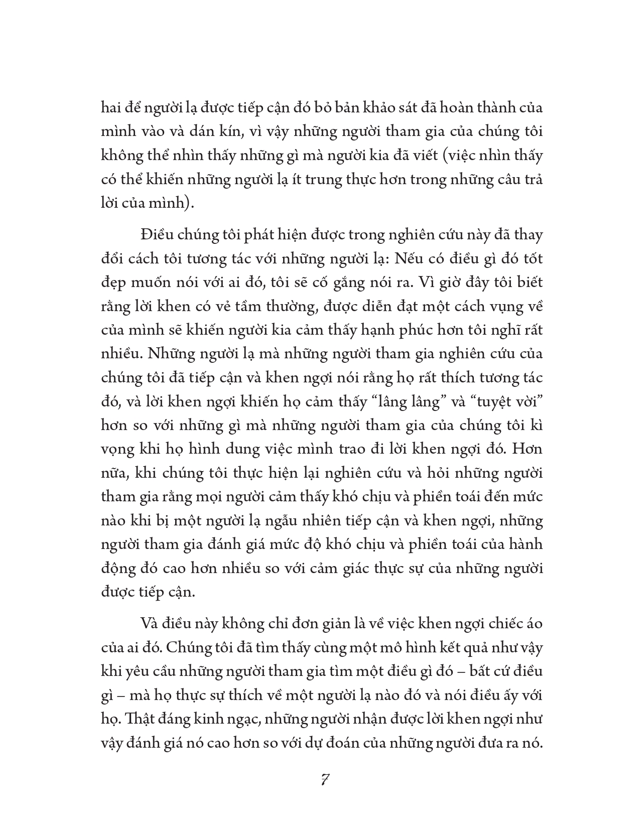 Chúng ta thường không khen người lạ hoặc bày tỏ lòng biết ơn đối với những người quan trọng trong cuộc sống của mình bởi chúng ta đánh giá thấp tác động từ lời nói của bản thân đến người khác: những người sẽ cảm thấy tuyệt vời biết bao khi nghe những điều tốt đẹp mà chúng ta nói.