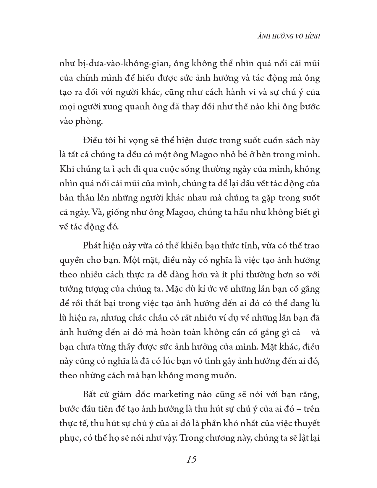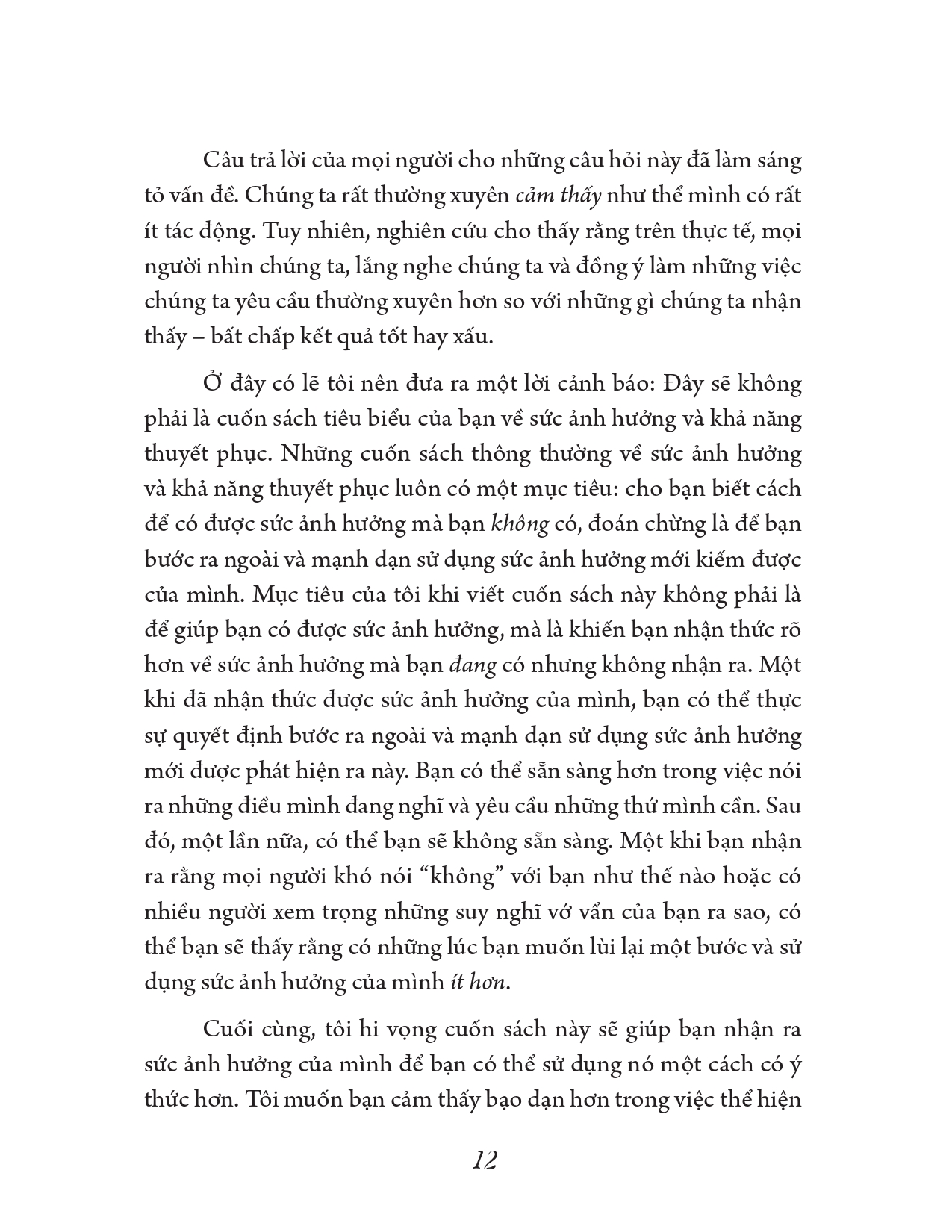 Không chỉ dành nhiều thời gian giảng dạy và nghiên cứu về hành vi xã hội, quan điểm và cảm xúc tự ý thức của con người, tác giả - Nhà Tâm lí học Xã hội kiêm Giáo sư về hành vi tổ chức tại Đại học Cornell, Vanessa Bohns đã giải thích lí do tại sao chúng ta không nhận ra sức ảnh hưởng mình có trong cuốn sách này. Đồng thời, bà cũng chỉ rõ ra rằng sự thiếu nhận thức về sức ảnh hưởng của bản thân có thể khiến chúng ta bỏ lỡ cơ hội, hay vô tình lạm dụng quyền lực của mình như thế nào.