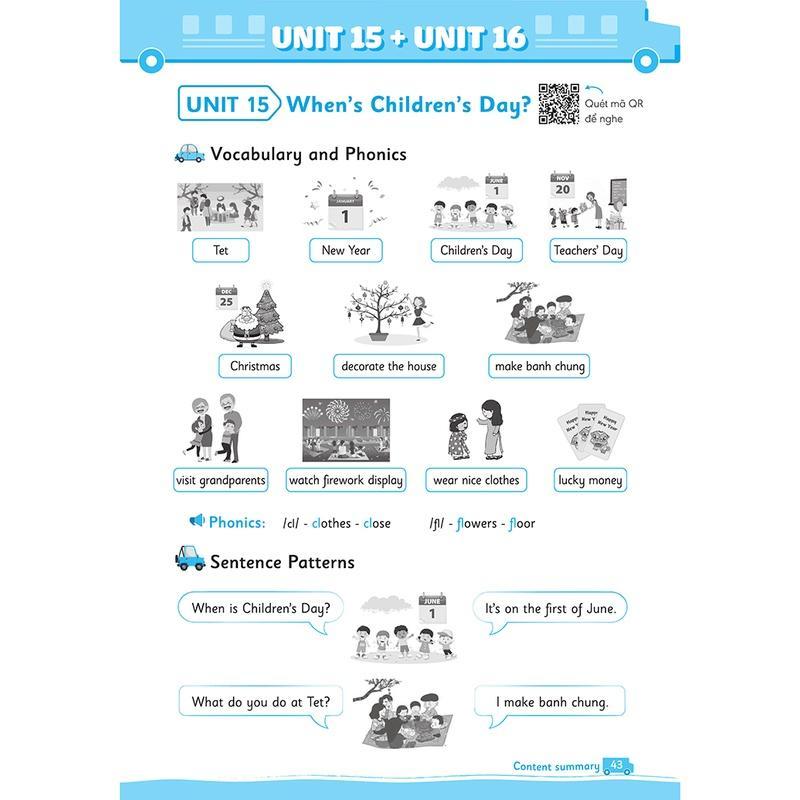 Cứ hai bài sẽ có 2 bài kiểm tra, tất cả các bài kiểm tra đều được thiết kế theo quy định thông tư mới nhất về kiểm tra môn Tiếng Anh tiểu học.