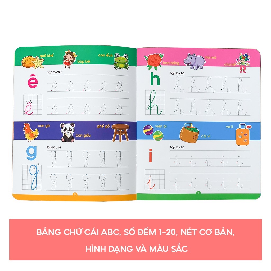 ❖ Trọn bộ bồm 5 quyển: Nét cơ bản, Chữ cái, Số đếm, Hình dạng Màu sắc, Trò chơi Mê cung.