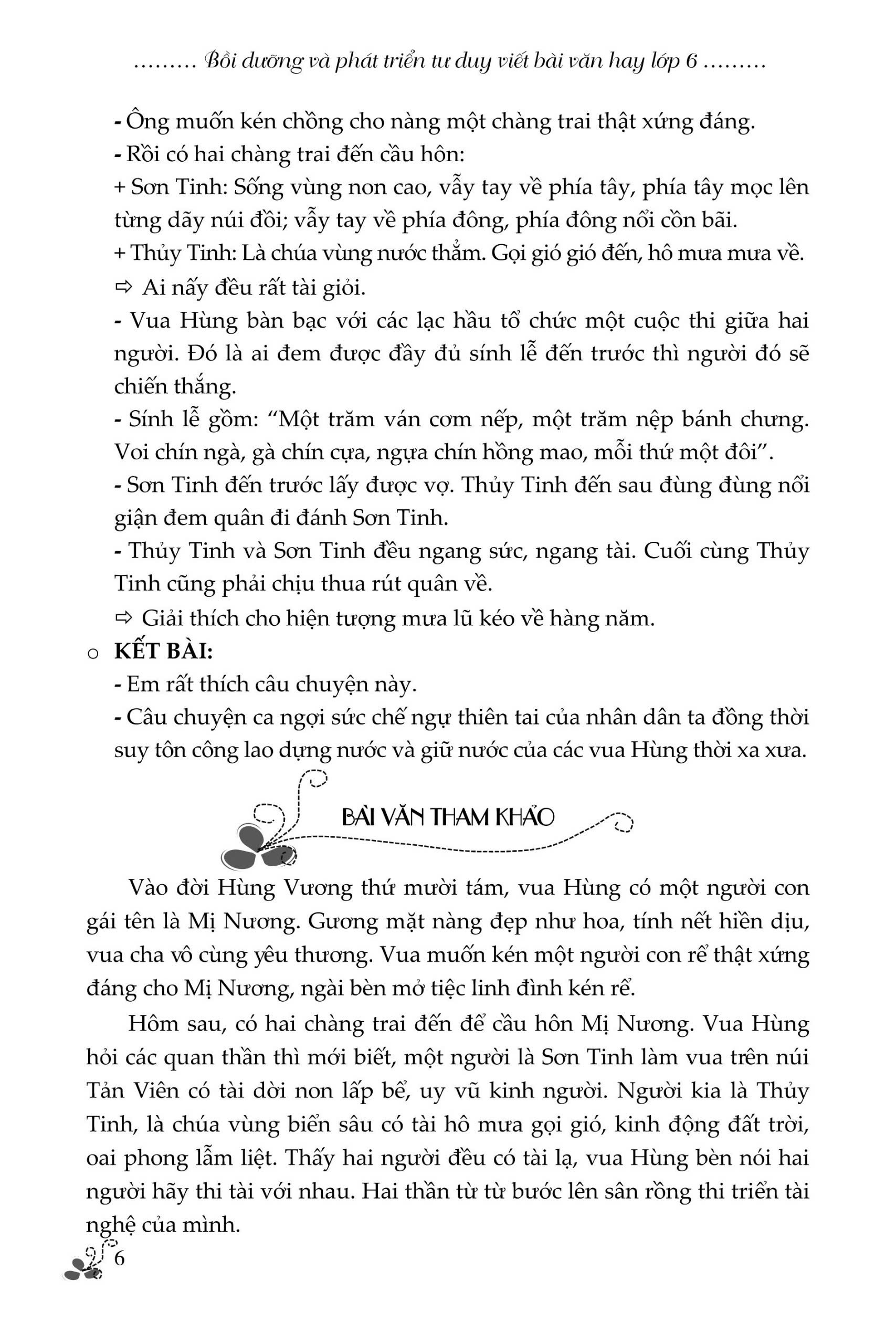 - Năm xuất bản : 2024 GIỚI THIỆU SÁCH Chương trình SGK mới rất chú trọng đến việc phát triển năng lực, phẩm chất của học sinh. Trong đó, kỹ năng Viết là một trong những nội dung học tập rất quan trọng. Để đáp ứng nhu cầu học tập, rèn luyện và nâng cao kỹ năng này, chúng tôi biên soạn cuốn sách: BỒI DƯỠNG VÀ PHÁT TRIỂN TƯ DUY VIẾT BÀI VĂN HAY LỚP 6 (Dùng chung cho 3 bộ SGK theo chương trình mới) Cuốn sách bám sát theo chương trình đổi mới của Bộ Giáo dục và Đào tạo. Các đề văn được biên soạn sao cho gần gũi, dễ hiểu, dễ thực hành cho học sinh. Đồng thời, dưới mỗi đề bài đều có phần hướng dẫn, gợi ý cùng đoạn văn, bài văn tham khảo. Tin chắc rằng, với cấu trúc như trên, cuốn sách sẽ là người bạn tri thức đáng tin cậy đối với các em. Nhân dịp cuốn sách được phát hành, chúng tôi xin được gửi lời cảm ơn chân thành nhất đến quý tác giả các tài liệu, hình ảnh, trích dẫn; các trang báo điện tử,... đã được chúng tôi tuyển chọn, chắt lọc và đưa vào sách nhằm tăng thêm tính hấp dẫn, thú vị, bổ ích. Hi vọng rằng quyển sách sẽ là tài liệu hữu ích trên bước đường chinh phục tri thức của các em học sinh. Đồng thời đây cũng là tài liệu tham khảo thiết thực dành cho giáo viên, phụ huynh trong việc giúp cho con em mình thực hiện tốt hơn kỹ năng VIẾT trong chương trình SGK mới. Dẫu rằng, chúng tôi đã rất cẩn trọng trong quá trình biên soạn nhưng thiếu sót là điều khó tránh khỏi. Rất mong nhận được nhiều ý kiến đóng góp quý báu từ quý độc giả xa gần để sách ngày càng được hoàn thiện hơn