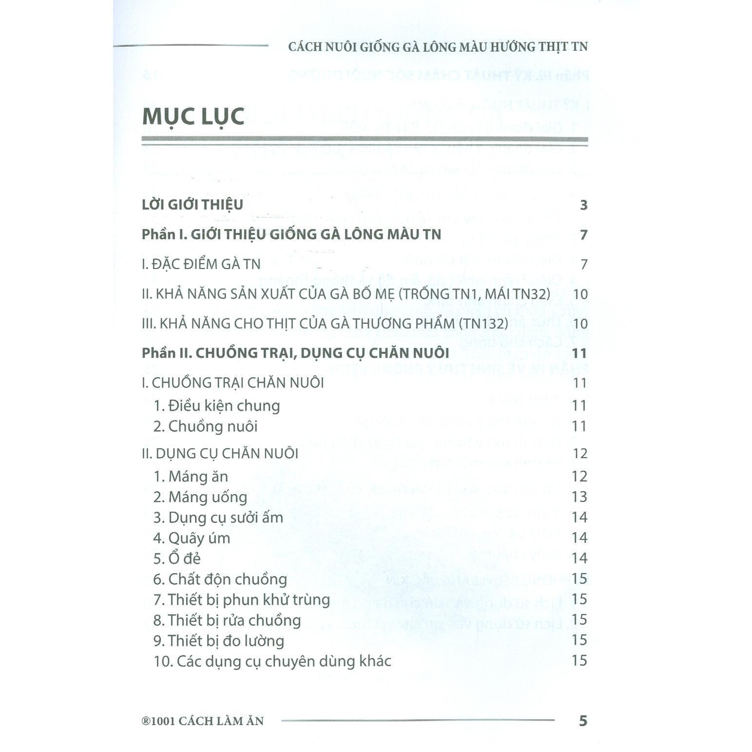 Mua tại TiktokCông ty TNHH MTV Nhà xuất bản Nông nghiệp, Ban biên tập và các nhà khoa học, các chuyên gia đã tổ chức biên soạn, xuất bản bộ sách "1001 cách làm ăn" để hướng dẫn cho người dân các kiến thức khoa học, công nghệ phổ thông, ứng dụng khoa học công nghệ mới, dạy nghề, và phổ biến các cách làm ăn thành công. Cuốn sách "Cách Nuôi Giống Gà Lông Màu Hướng Thịt TN" gồm 4 phần;