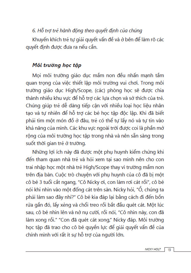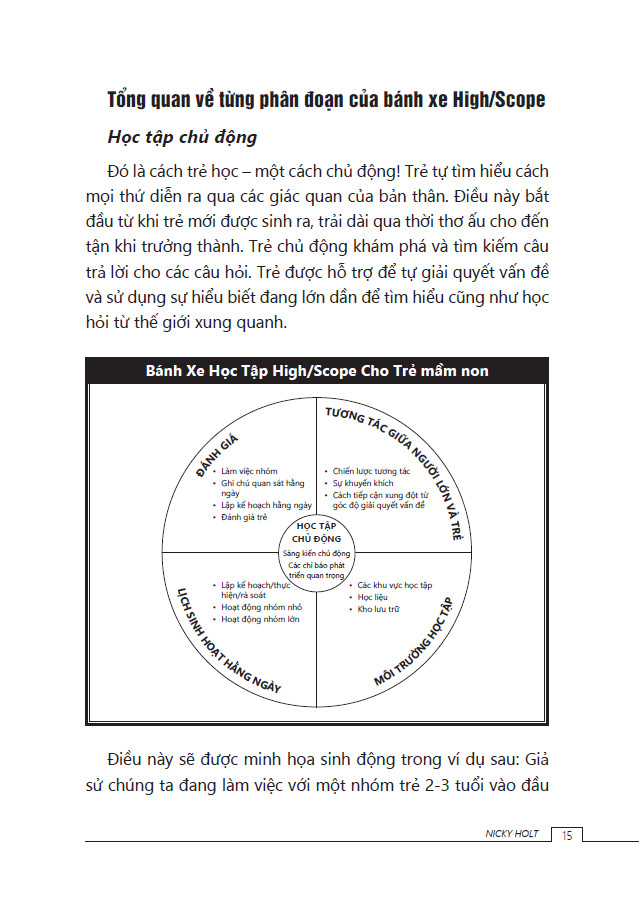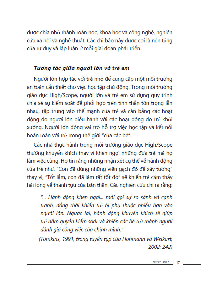 GIỚI THIỆU TÁC GIẢ, HIỆU ĐÍNH, DỊCH GIẢ Nicky Holt là chuyên gia trong lĩnh vực giáo dục giai đoạn đầu đời tại Vương quốc Anh. Tác giả đã có 14 năm khai thác, triển khai và phát triển cách tiếp cận High/Scope với tư cách một nhà tư vấn và đào tạo cho các cơ sở giáo dục mầm non địa phương. Người hiệu đính TS. Phạm Thị Thu, giảng viên khoa Giáo dục Mầm non, Trường Cao đẳng Sư phạm Trung ương. Cô Phạm Thị Thu có 17 năm kinh nghiệm trong giáo dục mầm non. Hiện tại cô đang là giảng viên chính, Trưởng bộ môn - Khoa Giáo dục Mầm non, trường Cao đẳng Sư phạm Trung ương. Bên cạnh hoạt động giảng dạy, cô cũng là chuyên gia của nhiều dự án phi chính phủ, như: “Giáo viên mầm non áp dụng các kiến thức và kỹ năng giảng dạy tạo môi trường học tập giàu ngôn ngữ cho trẻ” (Talk, VVOB, 2022 - 2026), “Cộng đồng ứng dụng giáo dục sáng tạo trong giáo dục mầm non tại Việt Nam giai đoạn 3” (VVOB, 2022), “Học thông qua chơi” (VVOB, 2019 – 2021), Quan sát trẻ theo quá trình (VVOB, 2021 - 2023), “Xây dựng dự án học tập giáo dục bảo vệ môi trường cho trẻ mầm non” (Unicef Việt Nam, 2022). Cô cũng là hướng dẫn viên chương trình " “Kỉ luật tích cực trong thực hành làm cha mẹ hàng ngày” (PDEP - Save the children) Dịch giả Hoàng Diệp Trinh Tốt nghiệp Cử nhân xuất sắc chuyên ngành Giáo dục mầm non tại Sydney, Australia. Cô có 05 năm học tập, nghiên cứu và làm việc tại nhiều cơ sở mầm non của Australia và 02 năm làm quản lý chuyên môn mầm non tại một trường liên cấp ở Hà Nội, Việt Nam; được đào tạo và nhận chứng chỉ IB PYP cho khối Tiền Tiểu học, cấp bởi Tổ chức Tú tài Quốc tế - IBO. Sách đã dịch: Cẩm nang Đào tạo giáo viên và Chăm sóc trẻ (The Big Picture & The Business of Child Care – Karen Kearns).
