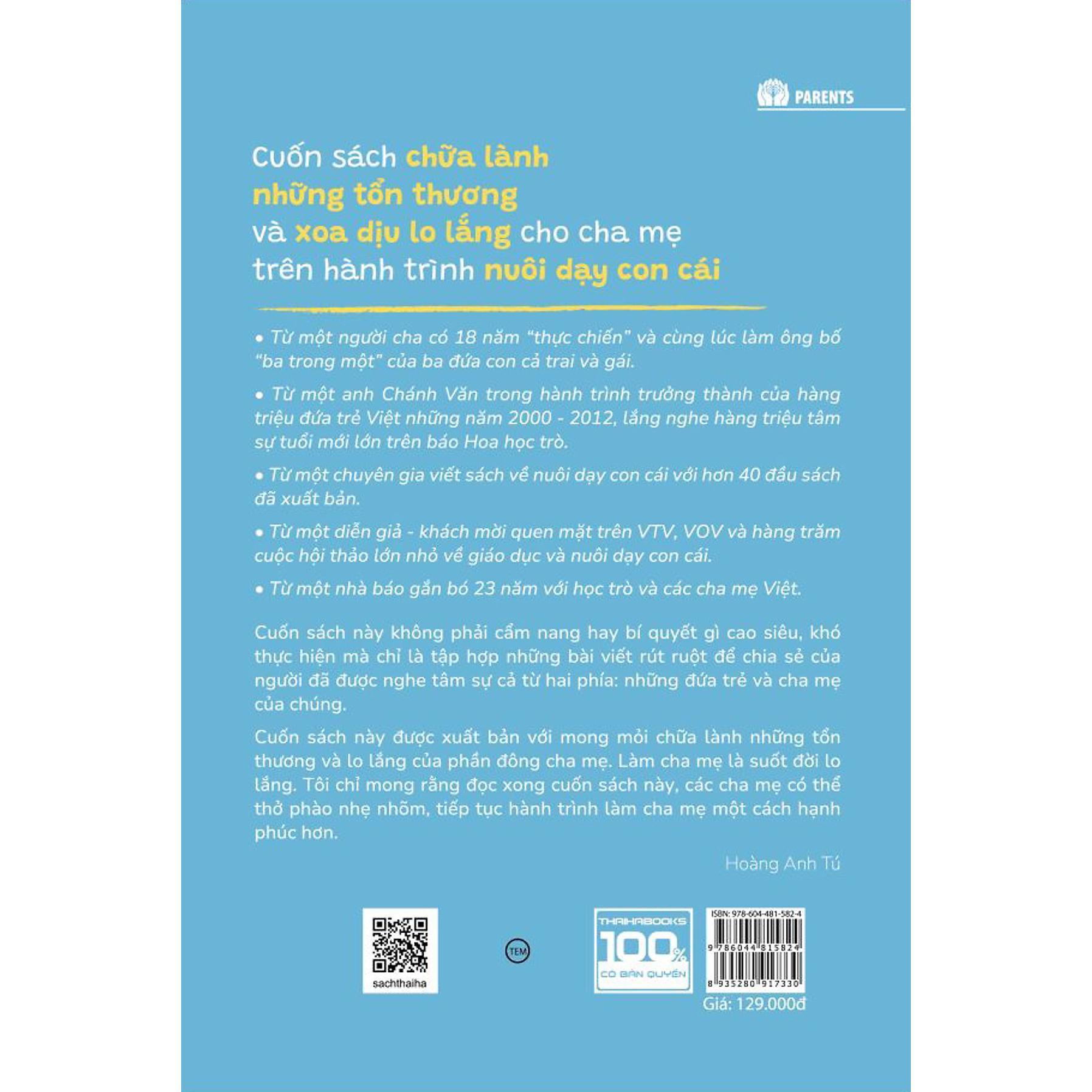 Cuốn sách này không phải cẩm nang hay bí quyết gì cao siêu, khó thực hiện mà là chia sẻ những bí quyết, kinh nghiệm để cha mẹ thấu hiểu con hơn, từ đó có cách giáo dục phù hợp. Cuốn sách với mong mỏi chữa lành những tổn thương và lo lắng của phần đông cha mẹ.