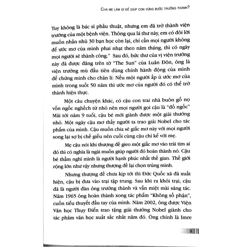 Đã có nhiều cuốn sách nói về bí quyết nuôi dạy con, chia sẻ những quan điểm trong việc nuôi dạy con cái. Tuy không có một phương pháp nào là chuẩn mực đối với mọi đứa trẻ, và cuốn sách Cha mẹ làm gì để con vững bước trưởng thành? là chia sẻ của những bậc cha mẹ về việc giáo dục, phát triển cho con cả về thể chất, trí tuệ lẫn tâm hồn. Với những gợi ý đơn giản, những bí quyết thiết thực và hữu ích, đây không chỉ là một cuốn sách hay mà còn là một món quà ý nghĩa, một người bạn hỗ trợ đắc lực dành cho những bậc cha mẹ mong muốn tâm hồn trẻ thơ của con phát triển toàn diện trong tương lai
