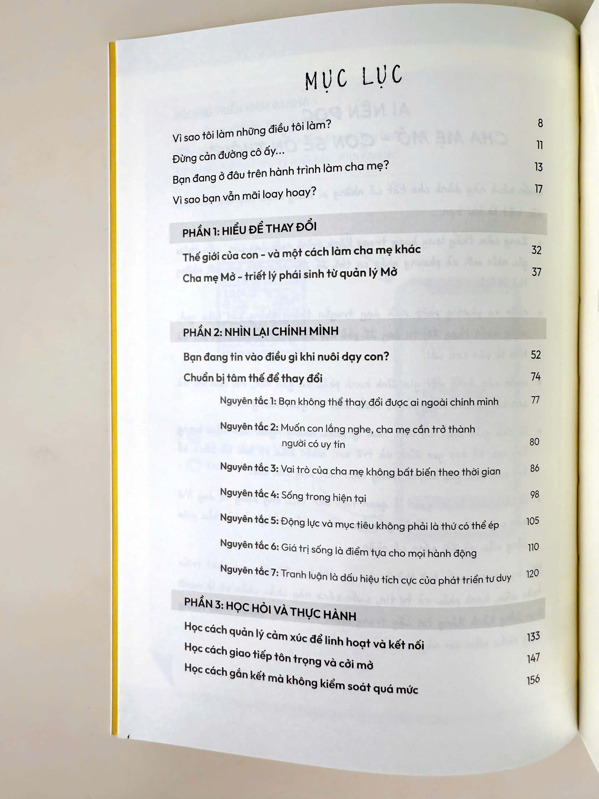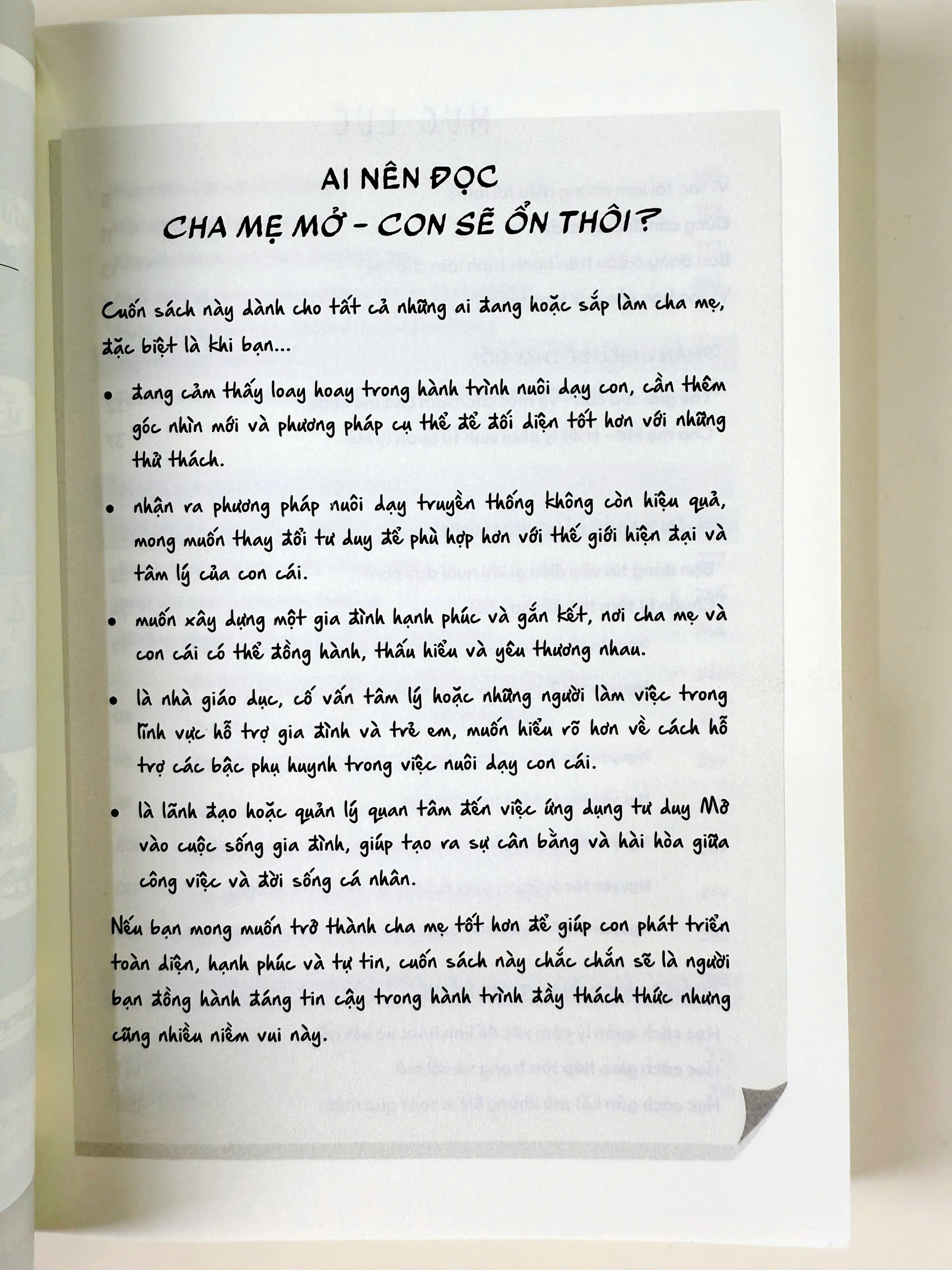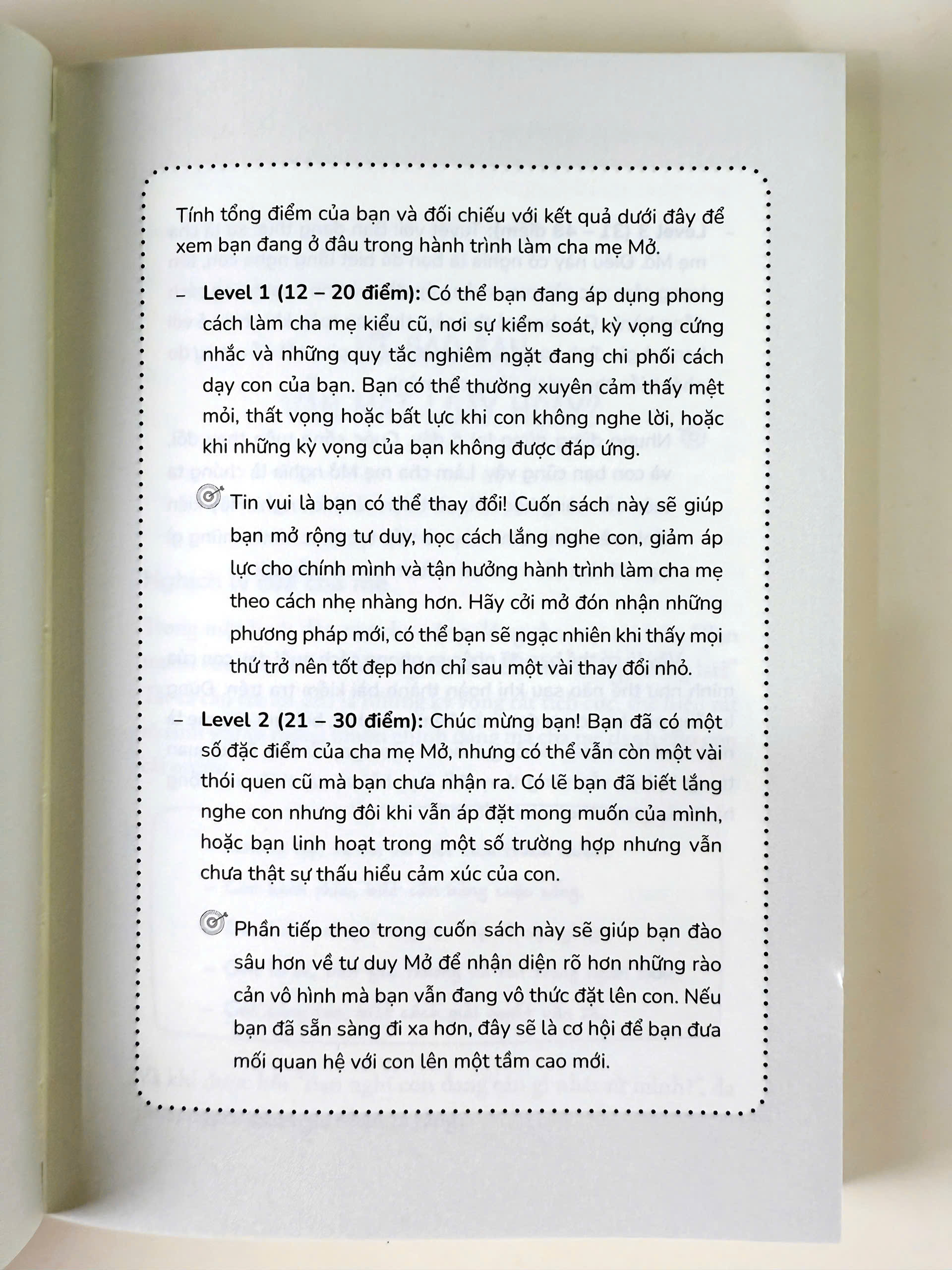 Làm cha mẹ chưa bao giờ là một hành trình dễ dàng – nhất là trong một thế giới đầy bất ổn, nơi mọi thứ thay đổi nhanh chóng và những phương pháp nuôi dạy con kiểu cũ đã trở nên lạc hậu. Cha mẹ Mở – Con sẽ ổn thôi được viết ra để đồng hành cùng bạn – những bậc phụ huynh đang tìm kiếm một cách tiếp cận mới, sâu sắc và nhân văn hơn trong việc kết nối với con và xây dựng một gia đình hạnh phúc, thấu hiểu.   Tiếp nối tinh thần của Con mình chẳng lẽ lại “vứt”? và Thế bây giờ mẹ muốn cái giề?, cuốn sách này không chỉ chia sẻ những câu chuyện đầy cảm xúc mà còn mang đến mô hình thực tiễn: “Cha mẹ Mở – 4 bước để đồng hành cùng con trong yêu thương”. Đây là công cụ giúp bạn từng bước thay đổi từ bên trong, bắt đầu từ việc hiểu chính mình đến việc trở thành người bạn đồng hành kiên định và đầy thấu hiểu của con.   2. Đối tượng độc giả Những bậc phụ huynh mong muốn xây dựng một gia đình hạnh phúc, thấu hiếu và kết nối   3. Đăc điểm nổi bật Với cuốn sách này, bạn sẽ tìm thấy