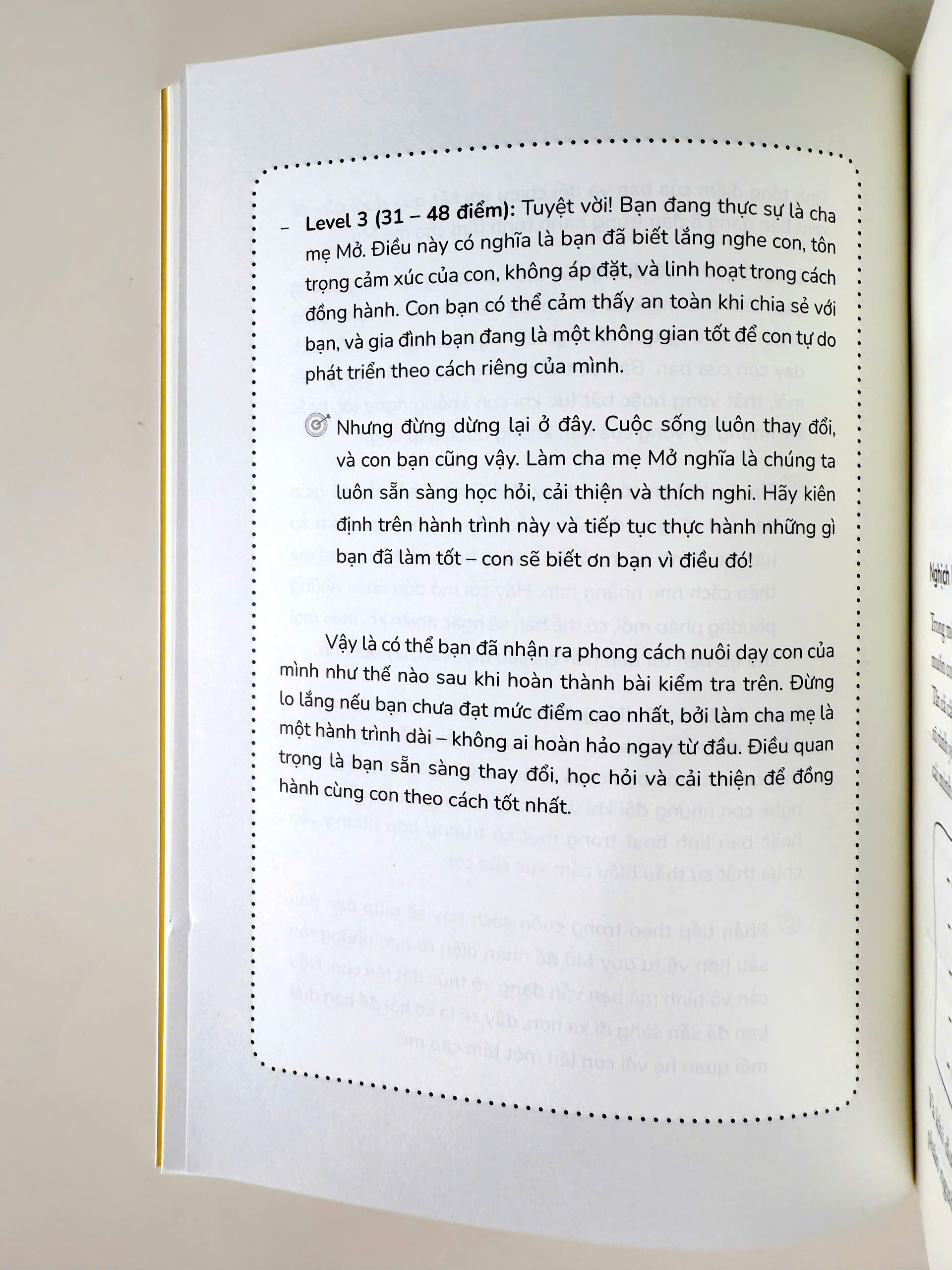 • Một mô hình 4 bước rõ ràng, dễ áp dụng để chuyển hóa tư duy và thực hành làm cha mẹ -Những câu chuyện thực tế giúp bạn nhận ra rằng mình không đơn độc -Cách tiếp cận nhẹ nhàng mà sâu sắc với những vấn đề phức tạp như trầm cảm, giới tính, nghiện game, thất tình, trộm cắp… -Những giải pháp không chỉ giúp con phát triển, mà còn giúp chính bạn trở nên hạnh phúc hơn