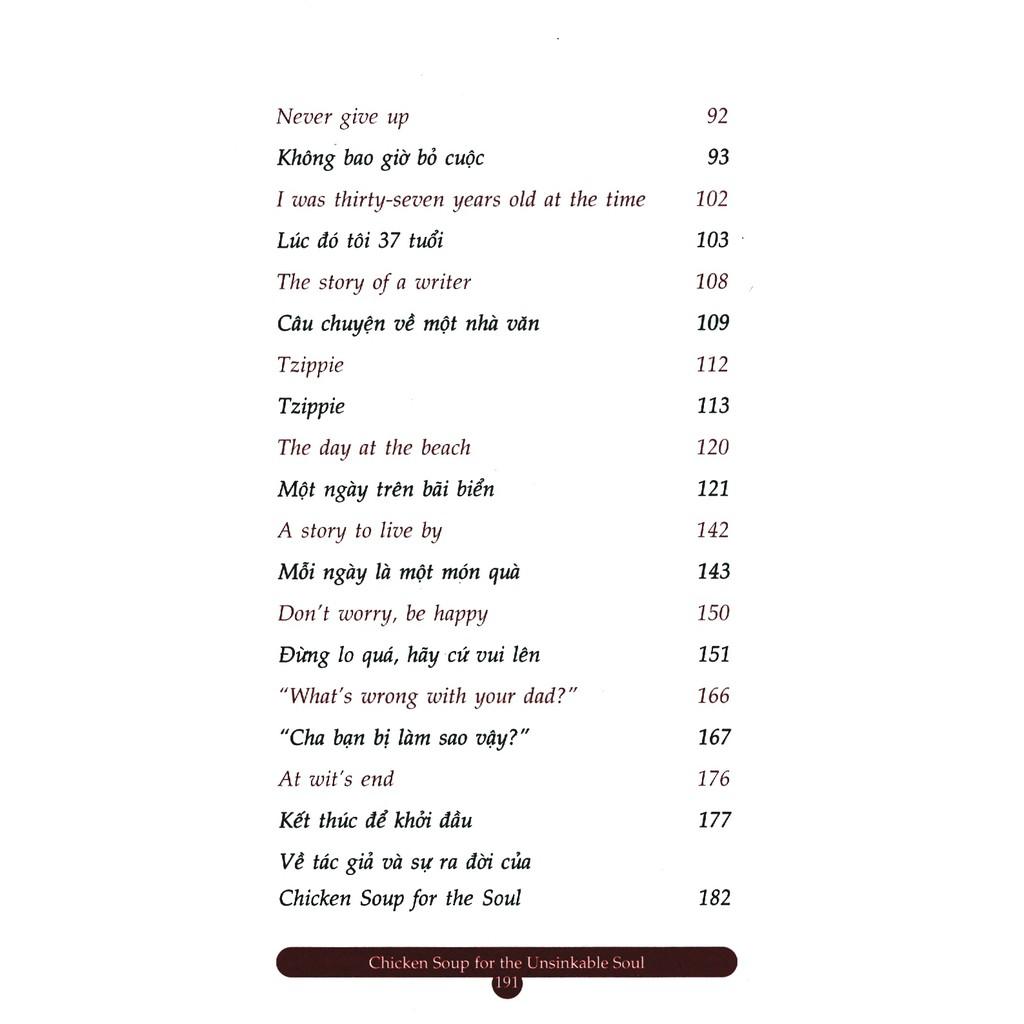Tiếp đến, Chicken Soup for the Unsinkable Soul cũng sẽ giúp bạn nhận ra giá trị đích thực của những tấm lòng biết sẻ chia. Chúng tôi hy vọng những mẩu chuyện nhỏ ấy sẽ khuyến khích bạn tìm đến mọi người khi bạn cần được giúp đỡ cũng như giúp bạn sẽ mở rộng trái tim mình với những ai đang cần tựa đầu vào bờ vai bạn. Và cuối cùng, có rất nhiều mẩu chuyện sẽ chứng minh cho chúng ta thấy rằng trở ngại cũng chính là người thầy tốt nhất của mỗi người. Chúng có thể khơi dậy sức mạnh tiềm tàng của ta, nhắc chúng ta nhớ về những khía cạnh cần hoàn thiện, chỉ dẫn chúng ta cách giữ vững lòng tin vào chính mình và hướng dẫn ta cách chấp nhận những việc không thuộc phạm vi kiểm soát của bản thân.