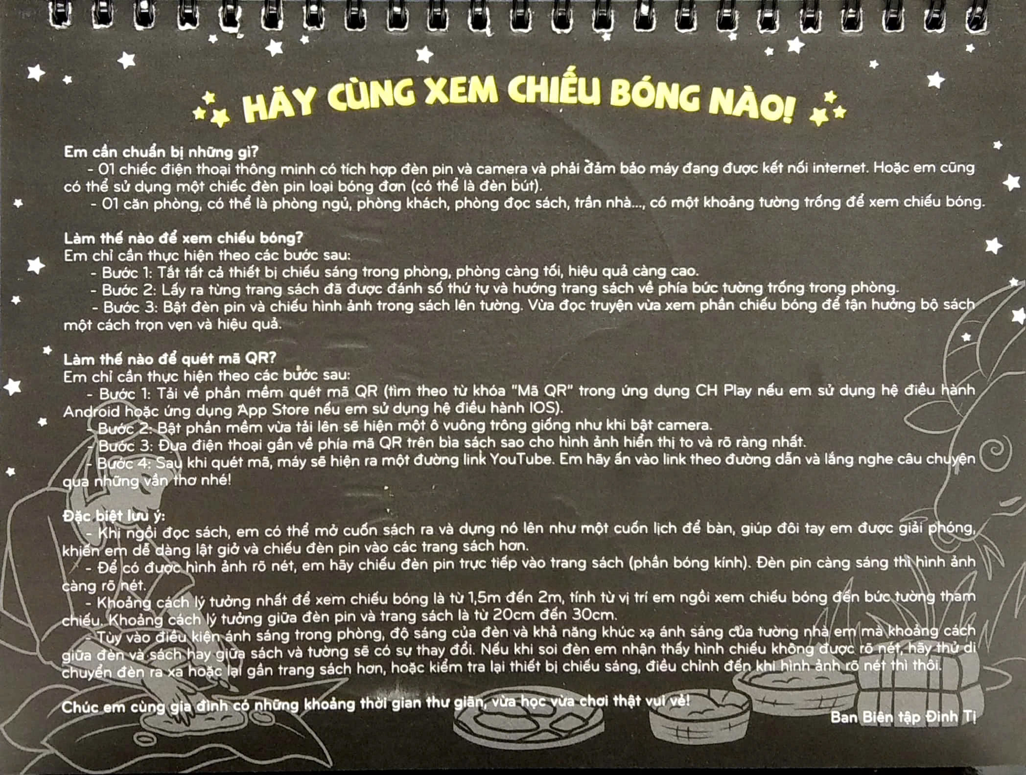 Với nỗ lực không ngừng của đội ngũ Sản xuất Đinh Tị Books, bộ Sách chiếu bóng thần kỳ phiên bản màu nâng cấp một lần nữa sẽ đưa các em đến với thé giới cổ tích bằng sự lung linh, kỳ ảo. Mỗi trang sách đều có kết cấu đặc biệt, chỉ cần dùng đèn pin chiếu qua, các hình ảnh với màu sắc sống động sẽ được phóng đại trên "màn chiếu" (tường nhà, trần nhà, cánh cửa...) tạo nên những bức tranh sinh động, khiến màn đêm vốn đáng sợ với các bạn nhỏ bỗng trở nên rực rỡ, thân thương. Không những thế, các câu chuyện trong sách đều được kể lại bằng thơ dưới dạng song ngữ, giúp các em vừa dẽ nhớ vừa có thẻ trau dồi thêm khả năng tiếng Anh một cách dễ dàng.