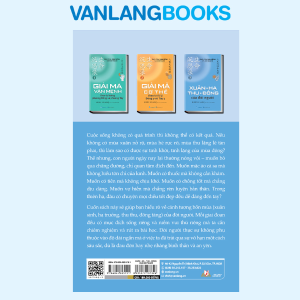 1/Giải mã vận mệnh theo tư tưởng phương Đông và phương Tây "Mệnh là thiên ý, là sứ mệnh được giao phó riêng cho mỗi người. Còn vận là hành trình – là cách ta bước đi, xoay trở và tạo ra dòng chảy cho cuộc đời mình. Mệnh không đổi, nhưng vận có thể chuyển hóa, điều chỉnh thông qua việc học hỏi, làm việc thiện, nỗ lực cá nhân và giác ngộ hàng ngày. Ba câu hỏi lớn nhất trong cuộc đời – “Tôi là ai?”, “Tôi đến từ đâu?” và “Tôi sẽ đi về đâu?” – chính là nỗi trăn trở muôn thuở của nhân loại trước vận mệnh. Trong khi sự vô minh lớn nhất về vận mệnh là khi chúng ta biết rõ mình nhưng vẫn mong muốn trở thành cái gì đó hoàn toàn khác. Cuốn sách này sẽ giúp bạn đọc hiểu rõ hơn về vận mệnh của đời người và triết lý của sinh mệnh từ hai góc nhìn: phương Đông và phương Tây. Từ đó, ta có thể tìm ra con đường phù hợp nhất để sống hòa hợp với đạo và đời, đạt được thành công và hạnh phúc trọn vẹn trong cuộc sống.   2/Giải mã cơ thể theo triết lý Đông y và Tây y "Con người sinh ra bệnh là do bản tính, nhưng người ta chỉ muốn giải quyết bệnh tật và vẫn phóng túng cái tâm tham, sân, si. Do đó, đối với hầu hết mọi người, bệnh tật chỉ là một trải nghiệm đau đớn chứ không phải điểm khởi đầu của sự nhận thức về bản thân. Dựa trên cả nền tảng lý luận của Đông y lẫn Tây y, tác giả từng bước lý giải nguyên lý vận hành của cơ thể con người. Qua đó, giúp người đọc hiểu rằng: chữa bệnh không nên chỉ dừng lại ở thuốc men hay bác sĩ, mà cần bắt đầu từ chính bên trong – từ tâm tính, thói quen và cách sống. Đây là cuốn sách của một bậc thầy Đông y, trị bệnh cứu đời bằng lòng thấu cảm. Tác giả đưa ra một góc nhìn độc đáo về sự khác biệt giữa Đông y và Tây y, lý giải vì sao nhiều căn bệnh hiện đại không thể chữa được bằng thuốc. Bệnh tật có liên quan đến nhân quả và bản tính con người. Cách tự cứu mình tốt nhất là sự giác tri, giác ngộ, thay đổi nhận thức và bản tính cố chấp, sống theo đạo sinh mệnh của trời đất, làm người tốt, việc tốt.   3/Xuân, Hạ, Thu, Đông của đời người "Cuộc sống không có quá trình thì không thể có kết quả. Nếu không có mùa xuân nở rộ, mùa hè rực rỡ, mùa thu lặng lẽ tàn phai, thì làm sao có được sự tinh khôi, tĩnh lặng của mùa đông? Thế nhưng, con người ngày nay lại thường nóng vội – muốn bỏ qua chặng đường, chỉ quan tâm đích đến. Muốn mặc áo cà sa mà không hiểu tôn chỉ của kinh. Muốn có thuốc mà không cần khám. Muốn có tiền mà không chịu khó. Muốn có chồng tốt mà chẳng dịu dàng. Muốn vợ hiền mà chẳng rèn luyện bản thân. Trong thiên hạ, đâu có chuyện mọi điều tốt đẹp đều dễ dàng đến tay? Cuốn sách này sẽ giúp bạn hiểu rõ về cảnh tượng bốn mùa (xuân sinh, hạ trưởng, thu thu, đông tàng) của đời người. Mỗi giai đoạn đều có mục đích sống riêng và niềm vui thú riêng mà ta cần chiêm nghiệm và rút ra bài học. Đời người thực sự không phụ thuộc vào độ dài ngắn mà ở việc ta đã trải qua sự vô hạn một cách sâu sắc, dù là đau đớn hay nhẹ nhàng bình thản và an yên.   Thông Tin Chi Tiết   Mã Hàng: COMBO3ĐCSMVĐN Nhà Cung Cấp: Công Ty Cổ Phần Văn Hóa Văn Lang Tác Giả: Khúc Lê Mẫn Người Dịch: Lê Tiến Thành Nhà Xuất Bản: NXB Hồng Đức Năm Xuất Bản: 2025 Ngôn Ngữ: Tiếng Việt Trọng Lượng: 1757 gram Kích Thước: 15 x 25 Số Trang: 832 Hình Thức: Bìa Mềm