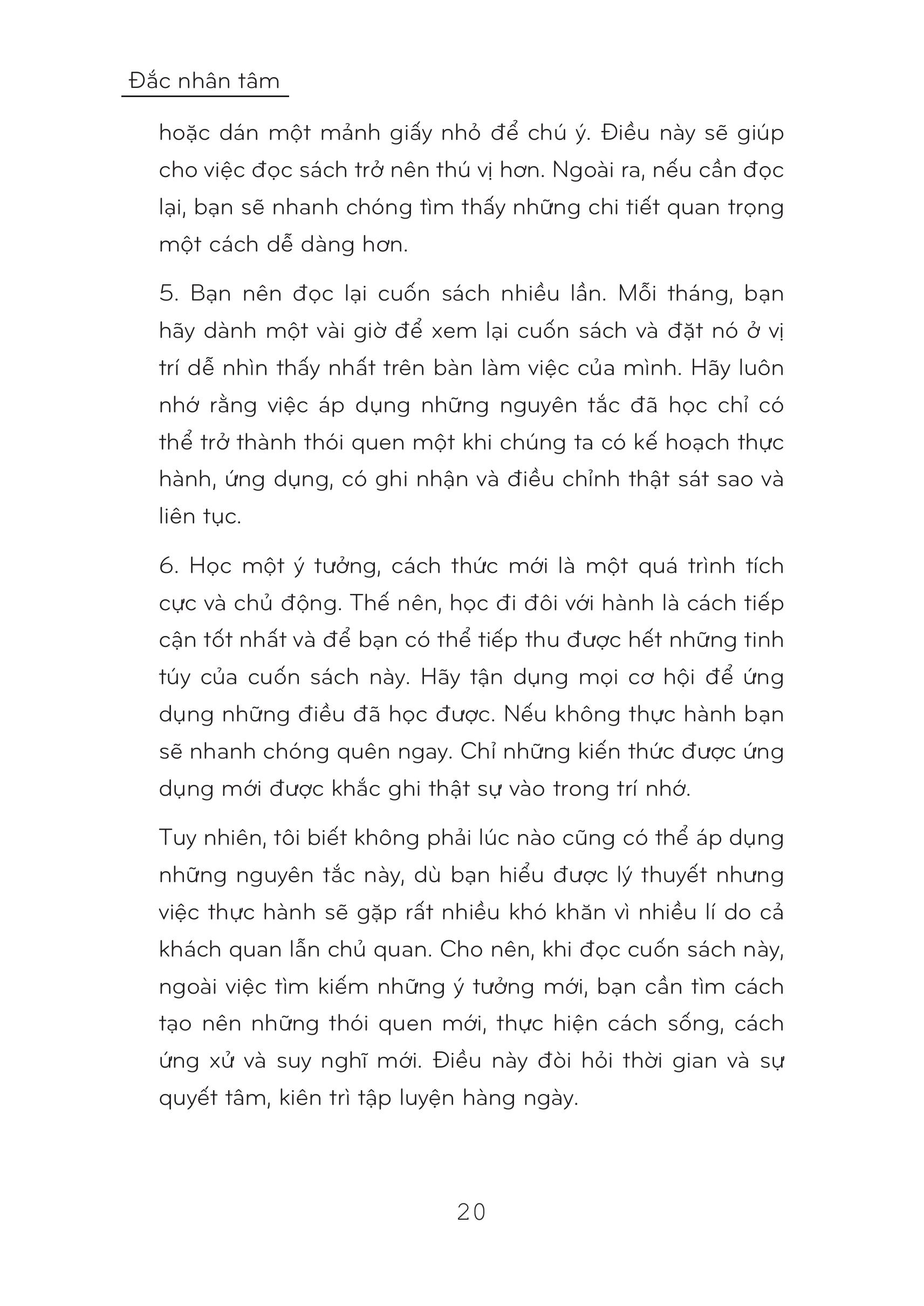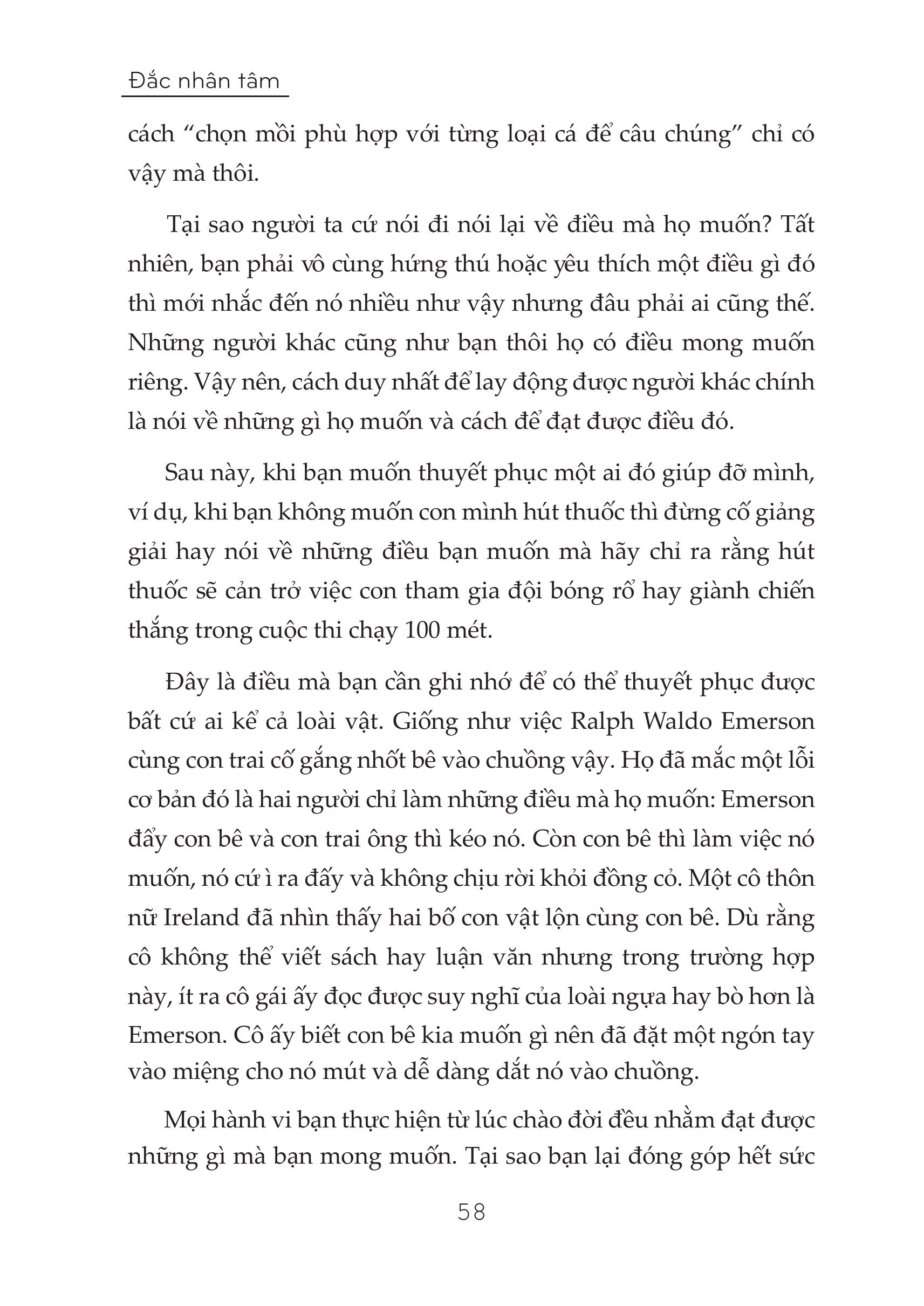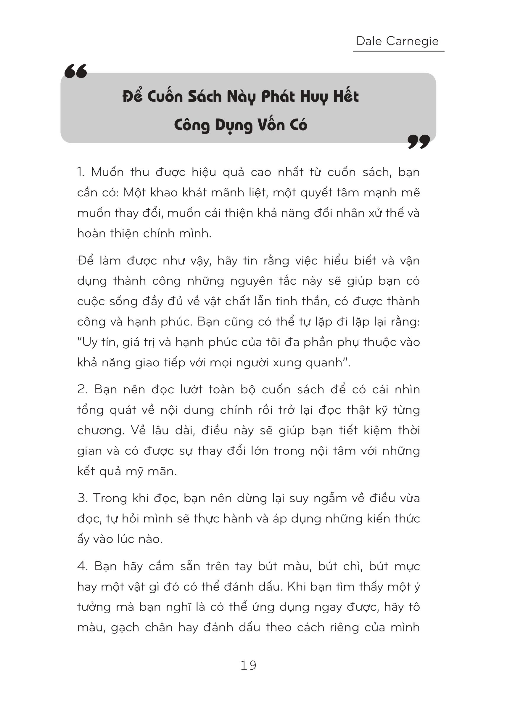 - ISBN: 9786044043982 GIỚI THIỆU SẢN PHẨM Nếu bạn còn lúng túng mỗi khi trò chuyện thì cuốn sách Đắc Nhân Tâm của tác giả Dale Carnegie chính là những gì bạn cần. Mỗi trang sách đúc kết kinh nghiệm từ bậc thầy giao tiếp sẽ mở ra những góc nhìn thú vị về tâm lý - hành vi của con người dưới tác động của ngôn từ. Các nguyên tắc trong đây sẽ là chìa khoá giúp cho cuộc sống của bạn trở nên hạnh phúc, thành công hơn. Đây là quyển sách duy nhất về thể loại self-help liên tục đứng đầu danh mục sách bán chạy nhất (best-selling Books) do báo The New York Times bình chọn suốt 10 năm liền và đã được dịch ra hơn 50 ngôn ngữ khác nhau Riêng bản tiếng Anh của sách đã bán được hơn 15 triệu bản trên thế giới. Tác phẩm có sức lan toả vô cùng rộng lớn - dù bạn đi đến bất cứ đâu, bất kỳ quốc gia nào cũng đều có thể nhìn thấy. Tác phẩm được đánh giá là quyển sách đầu tiên và hay nhất, có ảnh hưởng làm thay đổi cuộc đời của hàng triệu người trên thế giới. Đắc nhân tâm và cái Tài trong mỗi người chúng ta. Đắc Nhân Tâm trong ý nghĩa đó cần được thụ đắc bằng sự hiểu rõ bản thân, thành thật với chính mình, hiểu biết và quan tâm đến những người xung quanh để nhìn ra và khơi gợi những tiềm năng ẩn khuất nơi họ, giúp họ phát triển lên một tầm cao mới. Đây chính là nghệ thuật cao nhất về con người và chính là ý nghĩa sâu sắc nhất đúc kết từ những nguyên tắc vàng của Dale Carnegie. SƠ LƯỢC VỀ NỘI DUNG Cuốn sách bao gồm 4 phần giúp cho mỗi cá nhân sẽ có thể hiểu được nguyên tắc cơ bản về nghệ thuật ứng xử, giúp người khác yêu mến, ủng hộ quan điểm cũng như giúp bạn trở thành một nhà lãnh đạo tài ba. Phần 1: Nguyên tắc cơ bản trong nghệ thuật ứng xử Phần 2: 6 các khiến cho người khác yêu mến bạn Phần 3: Làm sao để người khác ủng hộ quan điểm của bạn Phần 4: Trở thành nhà lãnh đạo: thay đổi quan điểm của người khác mà không vấp phải sự phản bác MỘT SỐ HÌNH ẢNH NỘI DUNG THAM KHẢO CAM KẾT