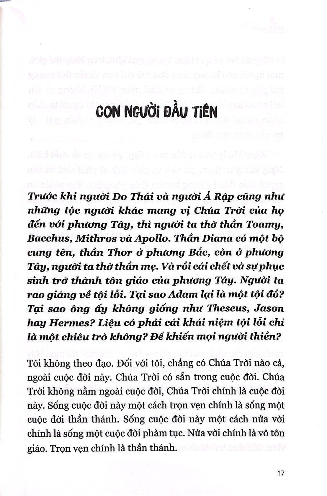 Đàn Ông - The Book Of Men Bạn thật may mắn khi được sống trong thời đại này bởi có một điều vô cùng vĩ đại sắp xảy ra – đó là sự gặp gỡ giữa khoa học và tôn giáo, sự gặp gỡ giữa Đông và Tây, sự gặp gỡ giữa hướng ngoại và hướng nội. Điều này sẽ tạo ra một con người mới, một con người có thể dễ dàng đi ra bên ngoài hoặc đi vào bên trong, đi vào thế giới hướng ngoại của khoa học hoặc đi vào thế giới hướng nội của tôn giáo – dễ dàng như khi bạn đi từ trong nhà ra vườn rồi lại quay trở vào nhà. Chẳng có gì khó khăn và bạn không cần sự thỏa hiệp nào cả. Mỗi lần ra khỏi nhà và bước lên bãi cỏ, bạn đâu có cần nhọc sức – bạn cứ thế bước ra mà thôi. Trong nhà lạnh quá còn ở ngoài kia, mặt trời rạng rỡ và ấm áp, bạn bước ra bãi cỏ, bạn ngồi xuống bãi cỏ. Rồi khi bên ngoài trở nên quá nóng, bạn lại đi vào nhà vì bên trong rất mát mẻ, chỉ đơn giản vậy thôi. Một con người toàn diện sẽ có thể dễ dàng đi vào khoa học và tôn giáo như bạn ra vào nhà m.ình vậy; cả bên trong lẫn bên ngoài đều thuộc về người đó. Carl Gustav Jung đã chia con người ra làm hai loại: hướng nội và hướng ngoại. Cách phân loại này có giá trị trong quá khứ nhưng sẽ hoàn toàn vô giá trị trong tương lai, vì con người tương lai sẽ đồng thời là cả hai. Trong quá khứ, chúng ta luôn phân loại theo cách này, nhưng con người tương lai sẽ không là đàn ông mà cũng không là đàn bà. Ở đây, tôi không nói đến khía cạnh sinh học – về mặt sinh học, đàn bà sẽ vẫn là đàn bà, và đàn ông sẽ vẫn là đàn ông. Nhưng về mặt tâm linh, người đàn ông tương lai sẽ có các đặc điểm nữ tính nhiều như người đàn bà, và người đàn bà tương lai cũng sẽ có các đặc điểm nam tính nhiều như người đàn ông. Về mặt tâm linh, sẽ không thể gọi họ là đàn ông hay đàn bà được nữa. Và đó chính là sự giải phóng đích thực – không chỉ là sự giải phóng của người đàn bà mà còn là sự giải phóng của người đàn ông – sự giải phóng khỏi trạng thái tù túng, sự giải phóng khỏi những phân loại mang tính bó buộc, sự giải phóng khỏi mọi tên gọi. Con người sẽ không còn là người đạo Hindu, người đạo Hồi, người đạo Cơ Đốc; con người sẽ không còn là người Ấn Độ, người Đức, người Anh; con người sẽ không còn là người da trắng hay người da đen. Không phải là không còn màu da – người da trắng sẽ vẫn là người da trắng và người da đen sẽ vẫn là người da đen – mà là những điều này sẽ chẳng còn quan trọng hay mang tính quyết định, chúng chỉ là những điều vụn vặt, vô nghĩa. Con người mới sẽ có một ý thức chung, và nền tảng của nó được tạo ra nhờ sự gặp gỡ giữa khoa học và tôn giáo. Trong cuốn Đàn ông, tác giả sẽ phân tích các vai trò khác nhau của người đàn ông, cũng như việc họ đã định hình và ảnh hưởng lên xã hội như thế nào. Đồng thời, ông chỉ ra làm thế nào đàn ông có thể chuyển hướng nguồn năng lượng vốn đang dẫn đến bạo lực, hung hăng sang sáng tạo và tiến hoá. MỤC LỤC: Lời nói đầu Phần 1: ADAM Con người đầu tiên Nạn nhân Con rô-bốt Động vật Cơn điên tình dục Phần 2: ADAM VÀ EVE Nam nhi đại trượng phu Tay chơi Bạn trai Người chồng Người cha Người bạn Phần 3: ADAM TRONG THẾ GIỚI Chính trị gia Người nổi loạn Nhà khoa học Người làm kinh doanh Chiến binh Người già Phần 4: CON NGƯỜI MỚI Con người mới Vượt qua nhị nguyên Người sáng tạo Người quan sát Đức Phật Zorba Đức Phật Đàn Ông Trích đoạn sách: Cơn điên tình dục Tình dục – đây chính là từ tạo ra sự hoang mang, hỗn loạn. Nó giống như ai đó ném một hòn đá xuống mặt hồ phẳng lặng; hàng triệu gợn sóng cuộn lên – chỉ vì từ tình dục. Nhân loại đã luôn sống dưới những ý tưởng vô cùng sai lầm. Bạn đã bao giờ để ý thấy rằng đến một độ tuổi nhất định nào đó thì tình dục trở nên rất quan trọng chưa? Không phải do bạn mà nó trở nên quan trọng. Nó xảy ra không phải do bạn; nó xảy ra một cách tự nhiên. Khi đến tuổi 14, khoảng tầm đó, đột nhiên, năng lượng ngập tràn tính dục. Cứ như thể những cánh cửa ngăn lũ bên trong bạn đã bị mở toang ra. Những nguồn năng lượng vi tế mà trước nay chưa từng mở ra đã mở ra và toàn bộ năng lượng của bạn mang đầy tính dục, nhuộm màu dục. Bạn nghĩ, bạn hát, bạn đi đều mang tính dục – mọi thứ đều mang tính dục. Mọi hành động đều được nhuộm màu. Chuyện này xảy ra; bạn chẳng làm gì cả. Nó là tự nhiên. Việc vượt lên trên tình dục cũng là tự nhiên. Nếu tình dục được sống theo một cách trọn vẹn, không lên án nó, không có ý muốn loại bỏ nó thì đến tuổi 42 – cũng như khi đến tuổi 14 thì tình dục được mở ra và toàn bộ năng lượng mang đầy tính dục, đến tuổi 42 hoặc khoảng tầm đó, những cánh cửa ngăn lũ kia sẽ đóng lại. Chuyện này cũng là tự nhiê