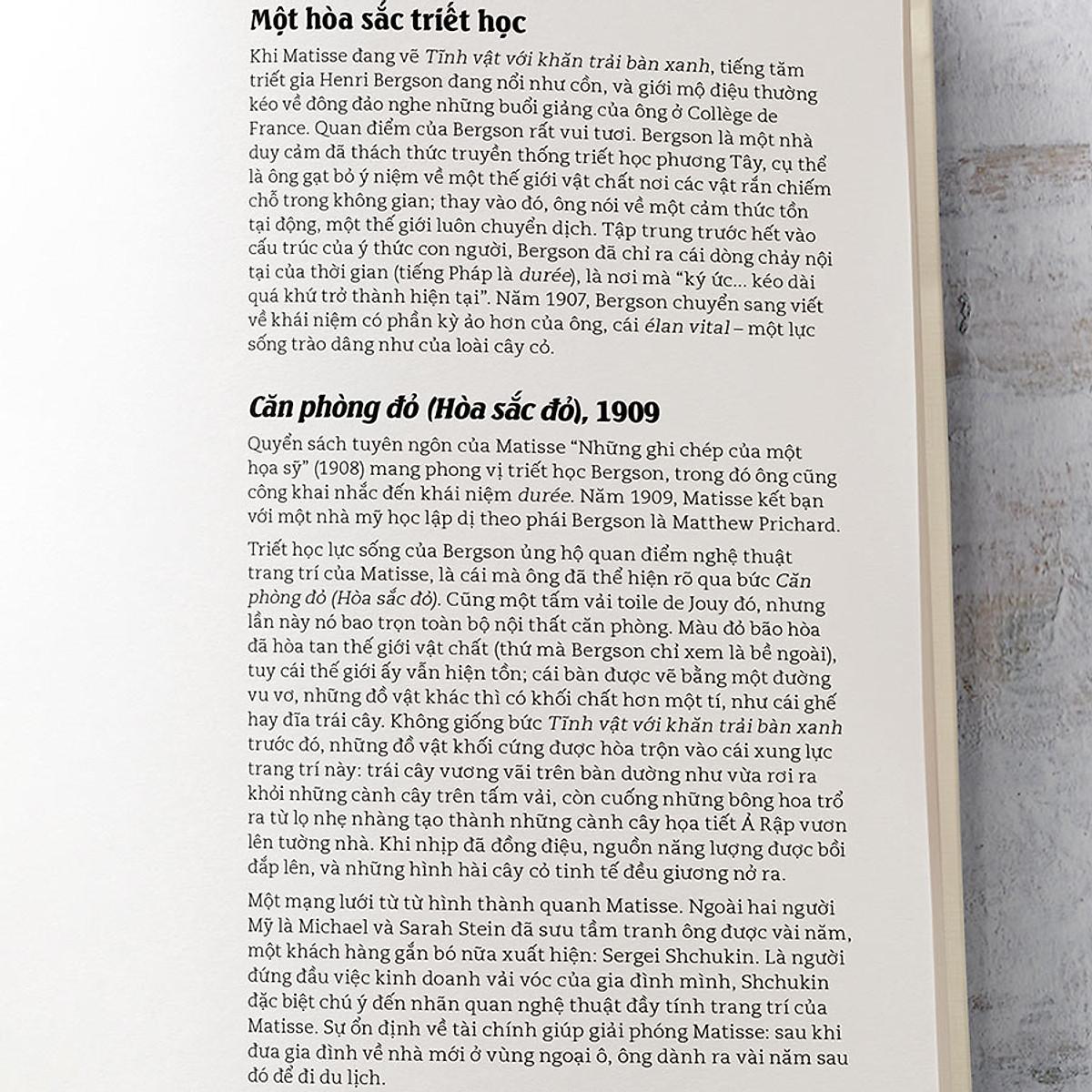 Phong cách nghệ thuật đó thể hiện rất rõ trong các tác phẩm nổi tiếng được giới thiệu trong cuốn sách như Chân dung bà Matisse: Đường màu lục; Xa hoa, bình yên và hoan lạc; Căn phòng đỏ…
