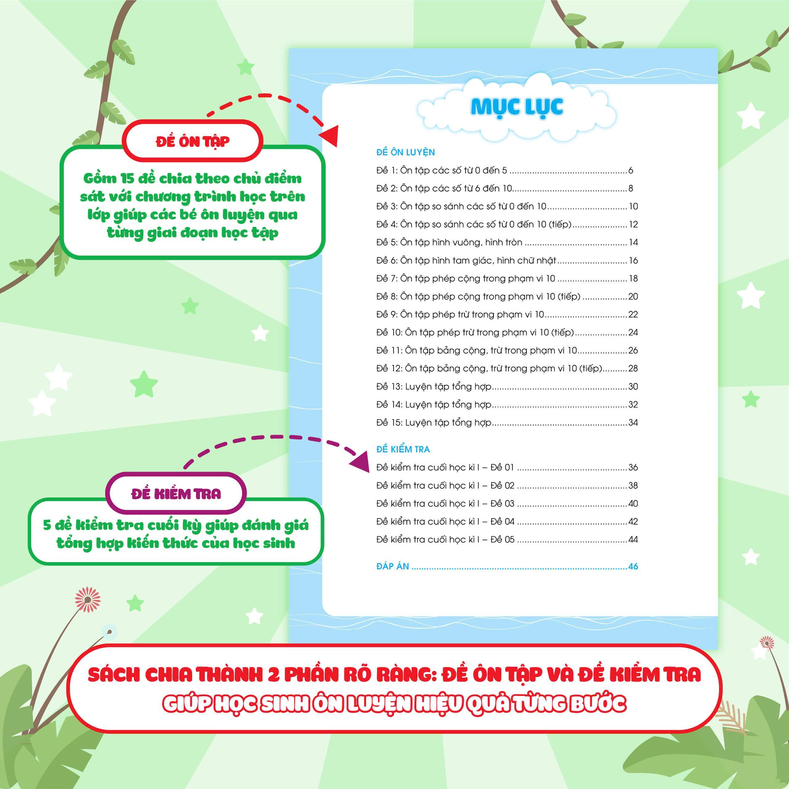 Đề ôn luyện và tự kiểm tra Toán lớp 1 tập 1 là một "trợ thủ" đắc lực giúp các em học sinh có thể tự ôn luyện sau mỗi giai đoạn học tập: ôn tập ngắn sau 2-3 tuần học, ôn tập giữa học kỳ và ôn tập cuối học kỳ - cuối năm học.