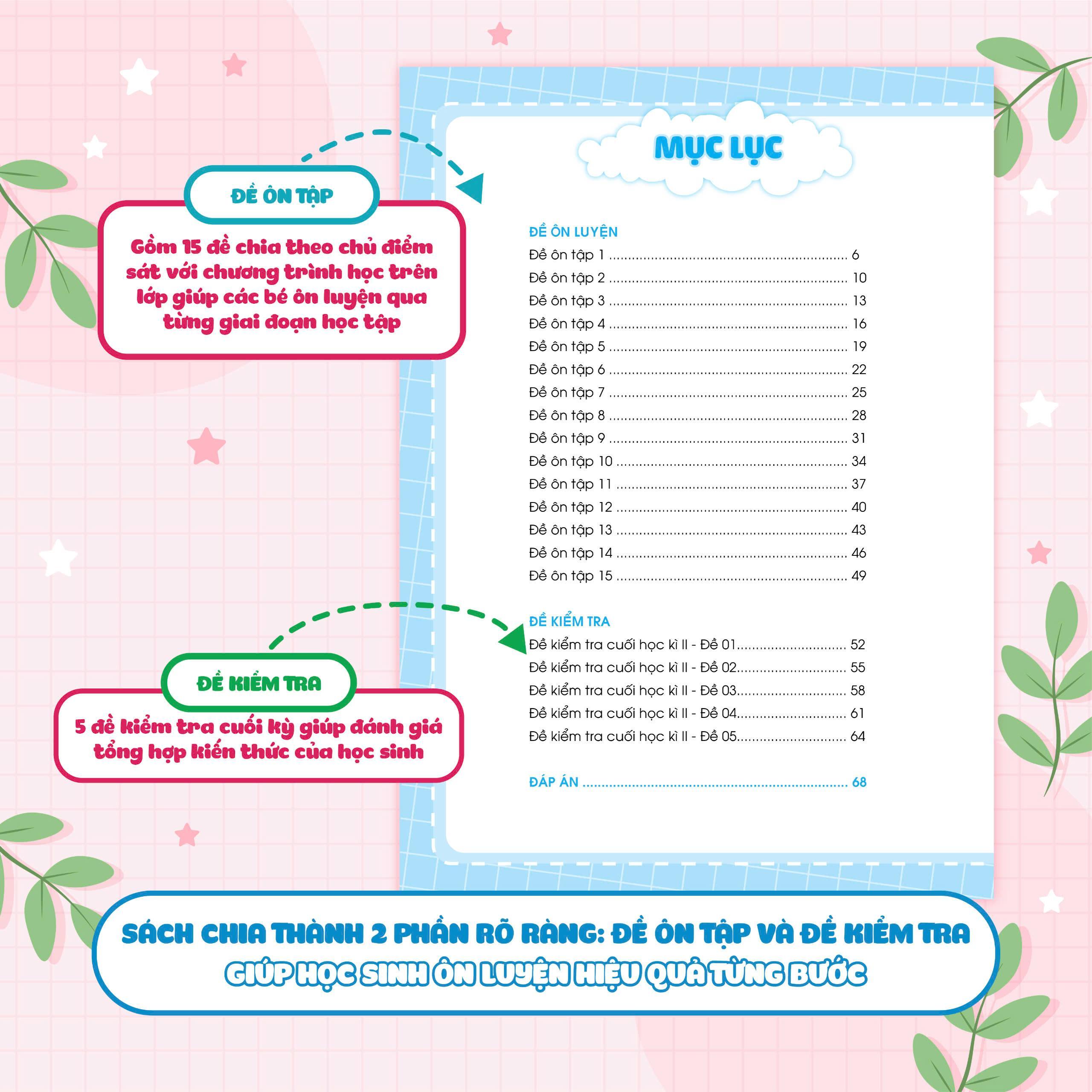 - Sách được chia thành 2 phần rất dễ hiểu cho các bé: Phần đề ôn tập và Phần đề kiểm tra. Phần đề ôn tập: Gồm 15 đề được chia theo các chủ điểm, hoặc chia thành các đề ôn tập theo sát chương trình học trên lớp theo giai đoạn. Phần đề kiểm tra: Gồm 5 đề kiểm tra cuối học kỳ để kiểm tra, đánh giá kiến thức tổng hợp của học sinh.