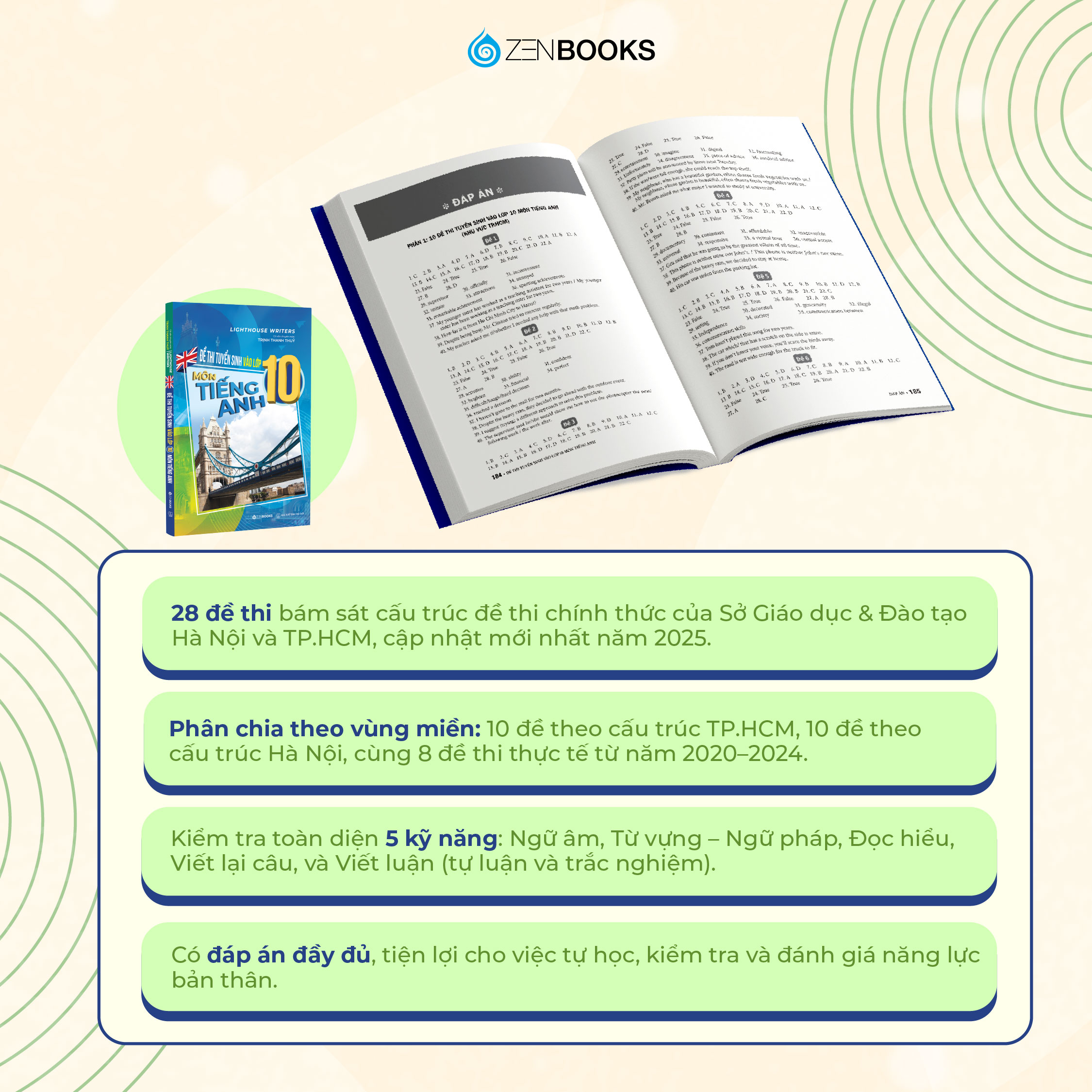 Đề Thi Tuyển Sinh Vào Lớp 10 Môn Tiếng Anh (Có Đáp Án) Tác giả: Trịnh Thanh Thủy Công ty phát hành: Zenbooks Nhà xuất bản: Thế giới Năm xuất bản: 2025 Giới thiệu về sách Đề Thi Tuyển Sinh Vào Lớp 10 Môn Tiếng Anh Đề Thi Tuyển Sinh Vào Lớp 10 Môn Tiếng Anh (Có Đáp Án) là tài liệu ôn luyện lý tưởng cho học sinh lớp 9 trong giai đoạn nước rút trước kỳ thi vào lớp 10. Cuốn sách tổng hợp các đề thi bám sát cấu trúc chính thức, giúp học sinh làm quen với dạng đề, nâng cao kỹ năng và tự tin bước vào kỳ thi quan trọng này. Nội dung nổi bật của sách - 28 đề thi cập nhật: Bao gồm 10 đề theo cấu trúc TP.HCM, 10 đề theo cấu trúc Hà Nội, và 8 đề thi thực tế từ 2020–2024. - Kiểm tra toàn diện: Đánh giá 5 kỹ năng: Ngữ âm, Từ vựng – Ngữ pháp, Đọc hiểu, Viết lại câu, và Viết luận (tự luận và trắc nghiệm). - Đáp án chi tiết: Hỗ trợ tự học, kiểm tra và đánh giá năng lực bản thân. - Phân chia theo vùng miền: Đáp ứng đặc thù đề thi của Hà Nội và TP.HCM, sát với thực tế. Điểm khác biệt của sách - Cập nhật mới nhất 2025: Phản ánh chính xác cấu trúc và xu hướng đề thi hiện tại. - Thực tiễn cao: Đề thi thực tế từ 2020–2024 giúp học sinh làm quen với áp lực thi thật. - Dễ sử dụng: Phù hợp cho tự học hoặc học cùng giáo viên/gia sư, với đáp án rõ ràng. - Uy tín biên soạn: Được đội ngũ giáo viên giàu kinh nghiệm của Zenbooks xây dựng cẩn thận. Đối tượng phù hợp Cuốn sách dành cho: - Học sinh lớp 9 ôn thi vào lớp 10, muốn nâng cao kỹ năng tiếng Anh. - Phụ huynh hỗ trợ con em ôn luyện hiệu quả cho kỳ thi quan trọng. -