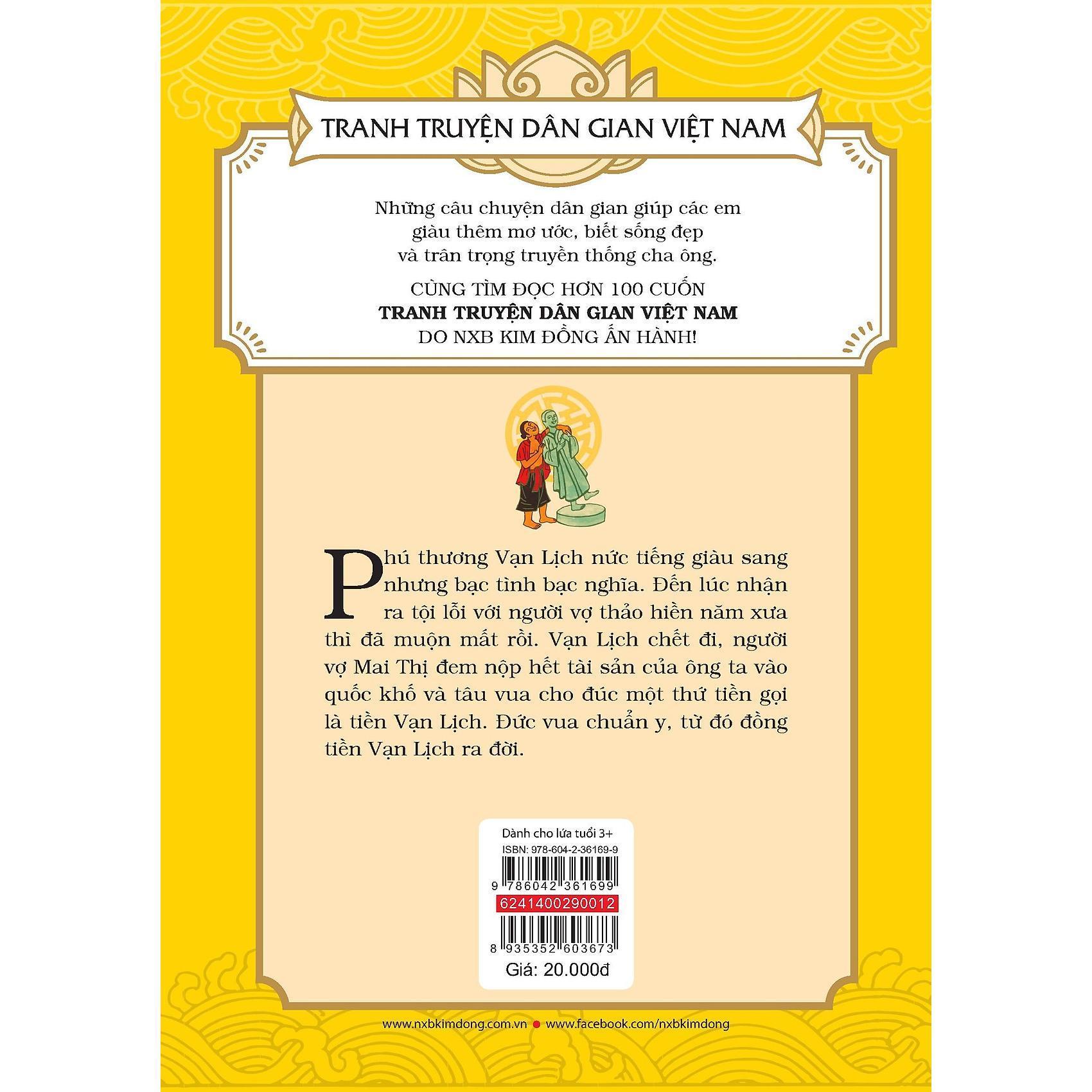 Tranh Truyện Dân Gian Việt Nam - Đồng Tiền Vạn Lịch Phú thương Vạn Lịch nức tiếng giàu sang nhưng bạc tình bạc nghĩa. Đến lúc nhận ra tội lỗi với người vợ thảo hiền năm xưa thì đã muộn mất rồi. Vạn Lịch chết đi, người vợ Mai Thị đem nộp hết tài sản của ông ta vào quốc khố và tâu vua cho đúc một thứ tiền gọi là tiền Vạn Lịch. Đức vua chuẩn y, từ đó đồng tiền Vạn Lịch ra đời. Những câu chuyện dân gian giúp các em giàu thêm mơ ước, biết sống đẹp và trân trọng truyền thống cha ông. Cùng tìm đọc hơn 100 cuốn Tranh truyện dân gian Việt Nam nhé!
