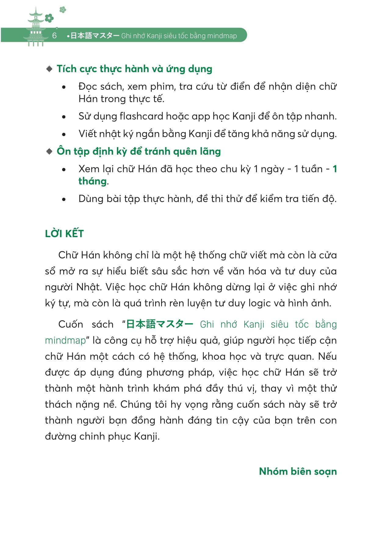 “ghi nhớ kanji siêu tốc bằng mindmap – trình độ sơ cấp” là cuốn sách giúp người học tiếng nhật tiếp cận kanji một cách dễ hiểu, dễ nhớ và có hệ thống. với phương pháp tư duy (mindmap) kết hợp hình ảnh trực quan, sách không chỉ dạy bạn thuộc mặt chữ, mà còn hiểu được quy luật hình thành – cách sử dụng – và ý nghĩa sâu xa đằng sau từng ký tự kanji. cuốn sách là công cụ lý tưởng để xây nền tảng kanji vững chắc từ đầu, tránh học vẹt và quên ngay sau khi học.