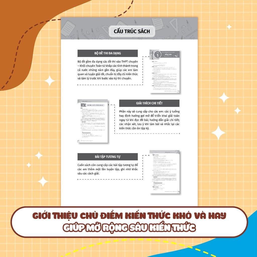 - Bộ đề thi đa dạng Bộ đề gồm đa dạng các đề thi vào THPT chuyên - khối chuyên Toán từ khắp các tỉnh thành trong cả nước những năm gần đây, giúp các em làm quen và luyện giải đề, chuẩn bị đầy đủ kiến thức và tâm lý trước khi bước vào kỳ thi chuyên. 29 đề thi sát với đề thi thật, giúp các em thực hành làm bài thi thử. Qúa trình luyện đề được xem là quan trọng nhất quyết định trực tiếp đến kết quả bài thi, vừa vận dụng kiến thức, làm quen với các dạng bài. Với 29 đề bám sát cấu trúc đề thi vào 10, tương đương với 29 lần làm bài thi thử, các em được thực hành giải đề, từ đó không còn bỡ ngỡ khi bước vào bài thi thật.