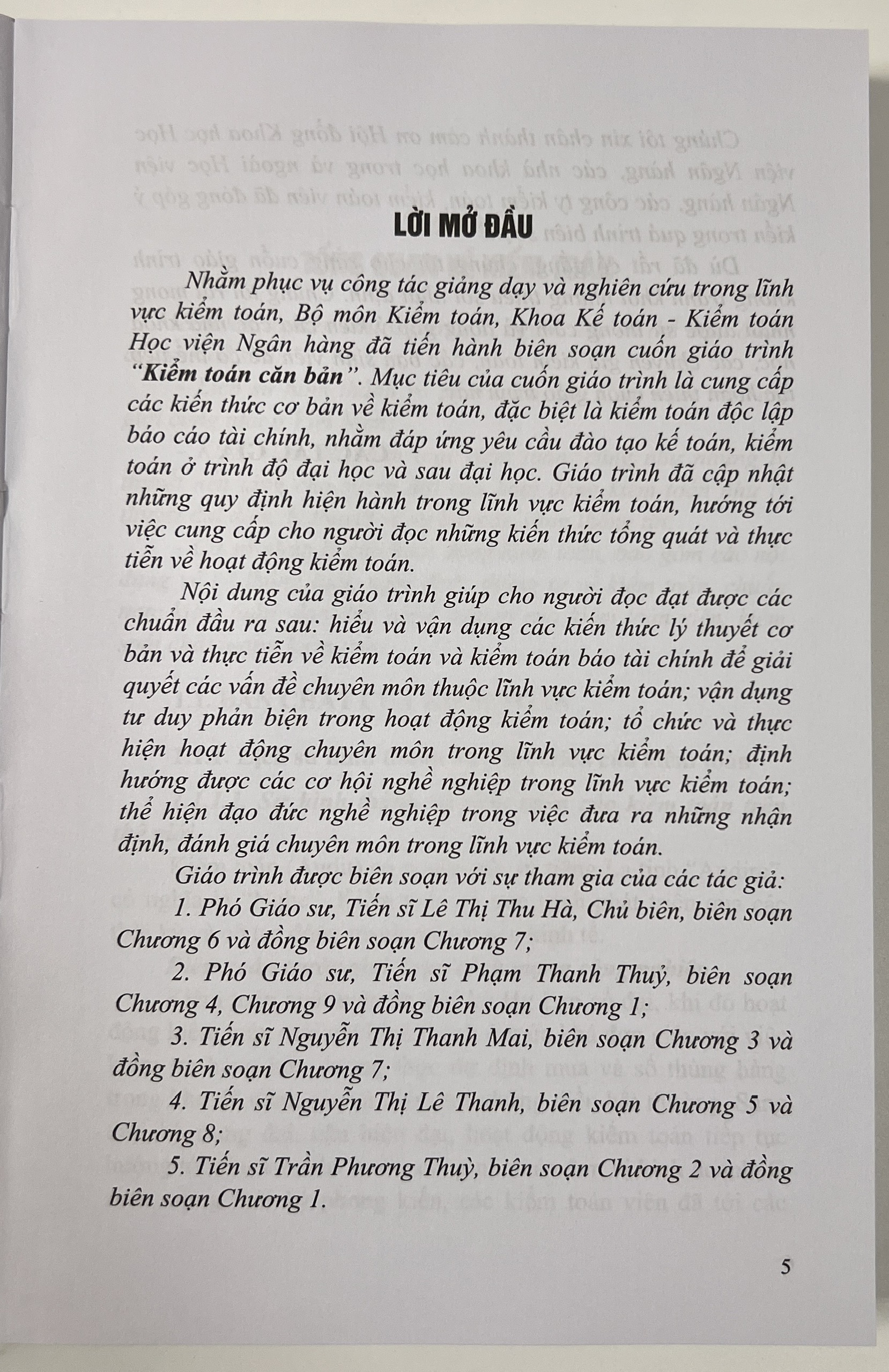 Nhằm phục vụ công tác giảng dạy và nghiên cứu trong lĩnh vực kiểm toán, Bộ môn Kiểm toán, Khoa Kế toán - Kiếm toán Học viện Ngân hàng đã tiến hành biên soạn cuốn giáo trình "Kiềm toán căn bản". Mục tiêu của cuốn giáo trình là cung cấp các kiến thức cơ bản về kiểm toán, đặc biệt là kiểm toán độc lập báo cáo tài chính, nhằm đáp ứng yêu cầu đào tạo kế toán, kiểm toán ở trình độ đại học và sau đại học. Giáo trình đã cập nhật những quy định hiện hành trong lĩnh vực kiểm toán, hướng tới việc cung cấp cho người đọc những kiến thức tổng quát và thực tiền về hoạt động kiêm toán.