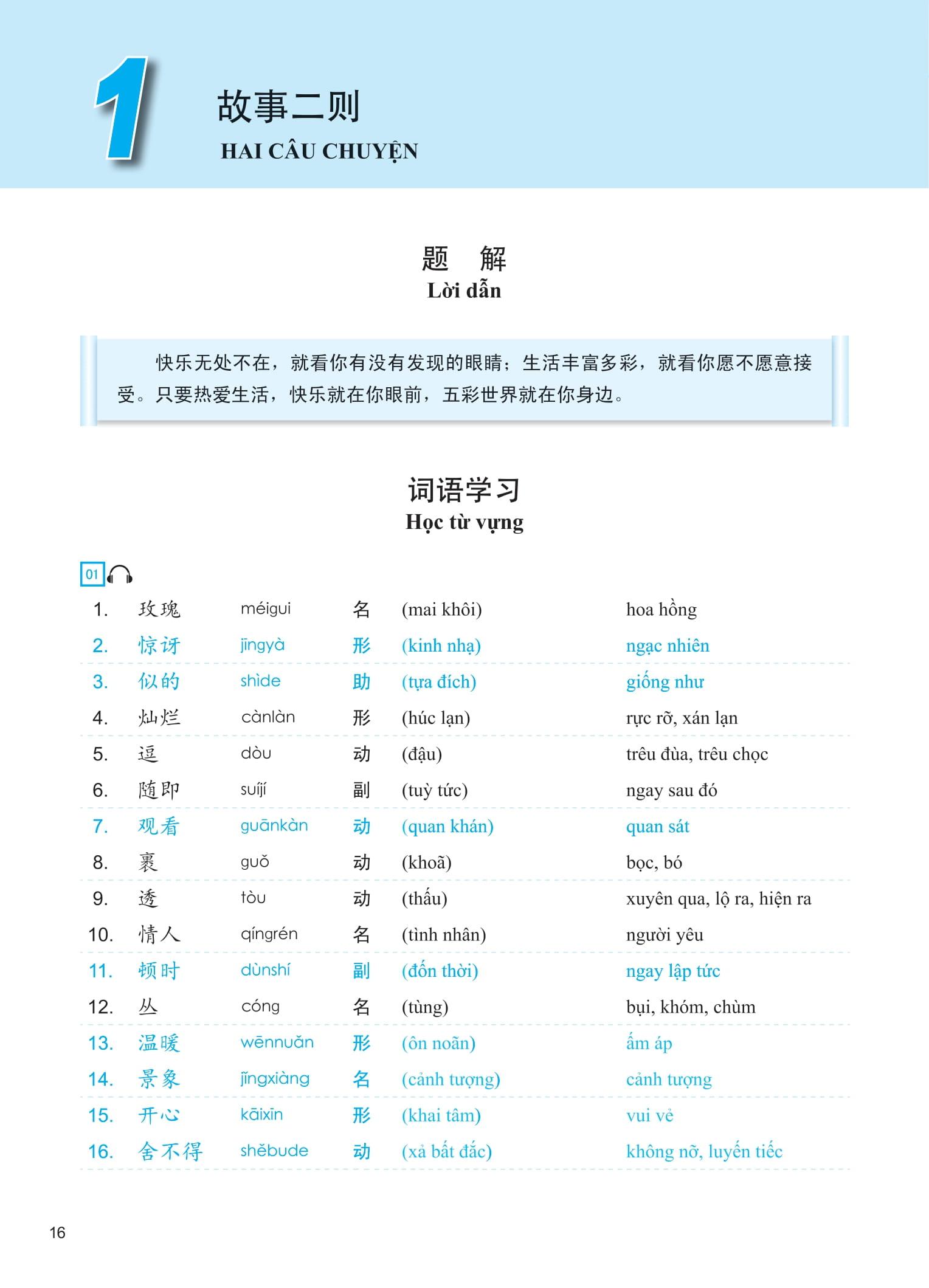 Giáo Trình Hán Ngữ 1 - Tập 1 - Quyển Thượng Các bài học trong “Giáo trình Hán ngữ 1” Tập 1 được thiết kế gồm 5 phần: 1. Bài đọc, 2. Từ mới, 3.