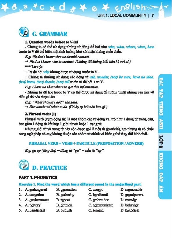 - Mỗi đơn vị bài học gồm 4 phần: +PART A: VOCABULARY (Từ vựng theo từng đơn vị bài học) +PART B: PRONUNCIATION (Lý thuyết phát âm) +PART C: GRAMMAR (Lý thuyết ngữ pháp trọng tâm) +PART D: PRACTICE (Cùng có PHÁT ÂM, TỪ VỰNG, NGỮ PHÁP, KỸ NĂNG ĐỌC và KỸ NĂNG VIẾT) Bên cạnh đó, hệ thống bài kiểm tra (TEST) đa dạng hình thức trắc nghiệm và tự luận, bám sát các nội dung, dạng bài trong đề thi thật giúp các em ôn tập và rèn luyện thước các kỳ thi 15 phút, 45 phút, cuối kỳ.