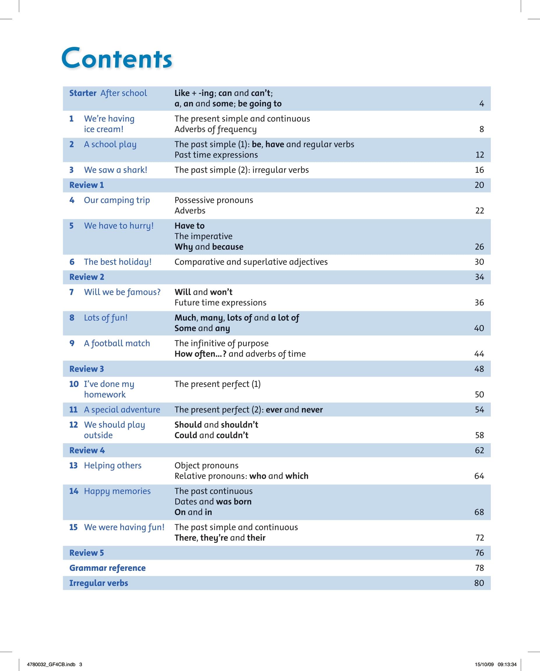 Cuốn sách gồm 15 bài học chính, được chia thành từng giai đoạn với các phần ôn tập (Review). Mỗi bài tập trung rèn luyện những chủ điểm ngữ pháp quan trọng: