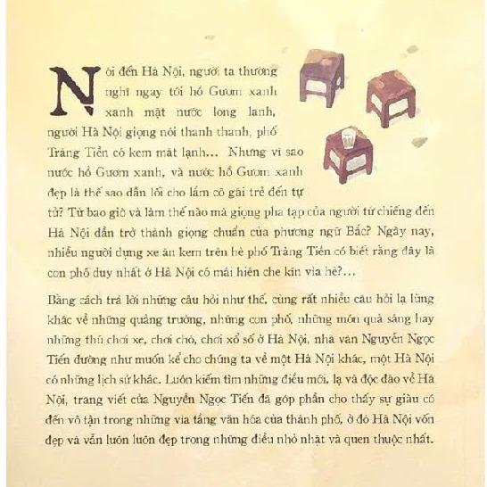 Nói đến Hà Nội, người ta thường nghĩ ngay tới hồ Gươm xanh xanh mặt nước long lanh, người Hà Nội giọng nói thành thanh, phố Tràng Tiền có kem mát lạnh... Nhưng vì sao nước hồ Gươm xanh, và nước hồ Gươm xanh đẹp là thể sao dẫn lỗi cho lắm cô gái trẻ đến tự tử? Từ bao giờ và làm thế nào mà giọng pha tạp của người tử chiếng đến Hà Nội dần trở thành giọng chuẩn của phương ngữ Bắc? Ngày nay, nhiều người dụng xe ăn kem trên hè phố Tràng Tiền có biết rằng đây là con phố duy nhất ở Hà Nội có mái hiện che kín vỉa hè?...
