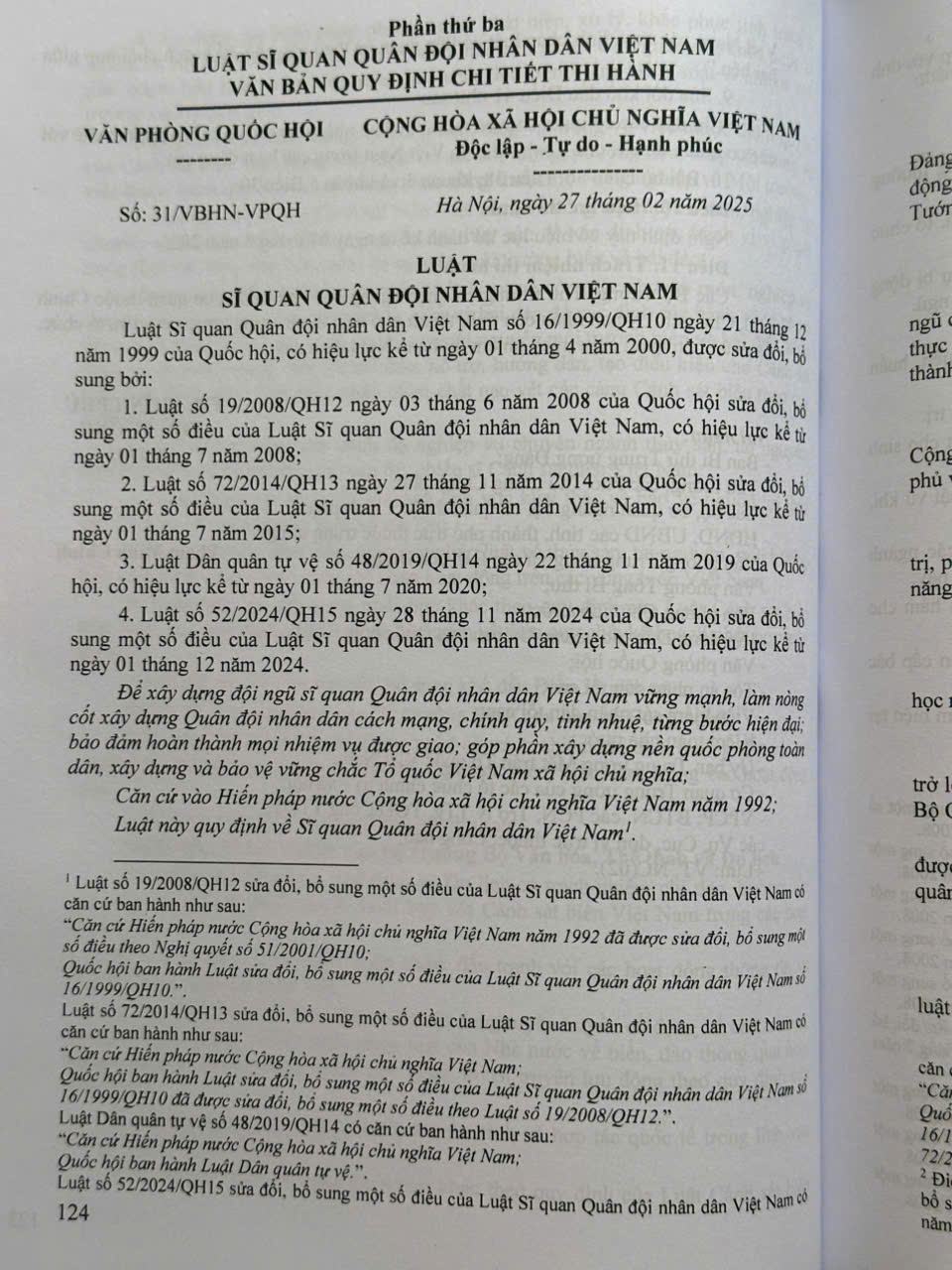 Luật Sĩ quan quân đội nhân dân Việt Nam năm 1999 (sửa đổi, bổ sung năm 2008, 2014, 2019, 2024) Khổ 13x19cm Năm XB 2025